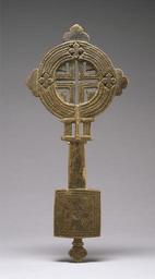 | Keywords: Ethiopian - Hand Cross - Walters 61342.jpg Hand-held crosses called hand or benediction crosses are carried by Ethiopian priests and offered to the faithful to be kissed during church services Made out of metal or wood the crosses are also used by priests to bless holy water and to perform exorcisms Beginning in the 16th century hand crosses also appear as signs of victory in icons and manuscripts where they are held by saints archangels and even the resurrected Christ This object has a conventional design but the cross in the center appears in silhouette As a result during benedictions this opening could be used to project a cruciform shadow onto the object or person receiving the blessing The rectangular base may be interpreted as a reference to the tabot or carved altar box venerated by Ethiopian Christians century 17 18 Early Modern wood cm 37 16 2 2 accession number 61 342 27214 Anonymous dealer Addis Ababa Ethiopia Richard Hubbard Howland 1963 by purchase Walters Art Museum Gift of Richard Hubbard Howland 1998 Angels of Light Ethiopian Art from the Walters Art Museum Birmingham Museum of Art Birmingham; Smith College Museum of Art Northampton; Museum of Biblical Art New York 2006-2007 place of origin Ethiopia Walters Art Museum license Art of Ethiopia in the Walters Art Museum Crosses from Ethiopia Media contributed by the Walters Art Museum needs category review Exorcism |