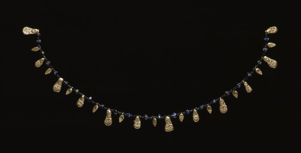 Keywords: Etruscan - Etruscan Necklace with Relief Pendants - Walters 571676.jpg Etruscan necklaces often combined a great variety of beads and pendants made from different materials This arrangement of 202 zinc-copper alloy beads 23 glass beads and 23 gold pendants is a reconstruction of the likely original The gold leaves are worked in repoussé and represent either a human head with a palmette or a bunch of grapes century 7 6 BC gold silver glass zinc-copper alloy as displayed cm 12 37 7 ; largest zinc bead cm 0 4 d ; largest glass bead cm 0 7 2 2 d x h ; cm 41 5 l accession number 57 1676 34772 Henry Walters New York date of acquisition unknown by purchase Mrs Henry Walters New York 1931 by inheritance Sale Joseph Brummer New York 1941 Walters Art Museum 1941 by purchase Museum purchase 1941 Jewelry - Ancient to Modern The Walters Art Gallery Baltimore 1979-1980 Objects of Adornment Five Thousand Years of Jewelry from the Walters Art Gallery Baltimore Cooper-Hewitt National Design Museum New York; Chrysler Museum of Art Norfolk; Carnegie Museum of Art Pittsburgh; San Antonio Museum of Art San Antonio; Philbrook Museum of Art Tulsa; Honolulu Academy of Arts Honolulu; New Orleans Museum of Art New Orleans; Milwaukee Art Museum Milwaukee; Minneapolis Institute of Arts Minneapolis; Toledo Museum of Art Toledo; The John and Mable Ringling Museum of Art Sarasota 1984-1987 Jewelry from the Walters Art Museum and the Zucker Family Collection The Walters Art Gallery Baltimore 1987 Bedazzled 5 000 Years of Jewelry from the Walters Art Museum Frist Center for the Visual Arts Nashville; The John and Mable Ringling Museum of Art Sarasota; The Walters Art Museum Baltimore 2006-2009 Bedazzled 5 000 Years of Jewelry El Paso Museum of Art El Paso 2010 place of origin Etruria in present-day Italy Walters Art Museum license Etruscan art in the Walters Art Museum Jewellery in the Walters Art Museum Etruscan necklaces Media contributed by the Walters Art Museum needs category review