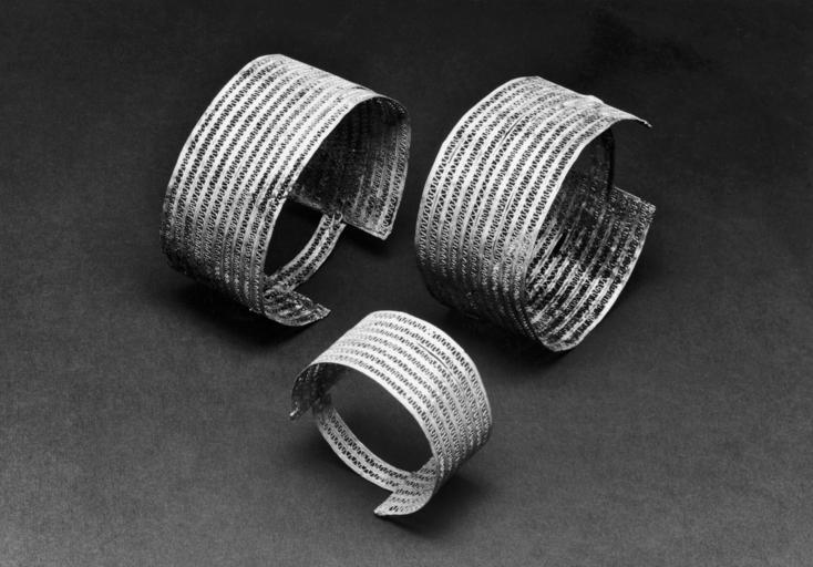 | Keywords: Etruscan - Group of Bracelets with Open Rows of Wire - Walters 57393, 57394, 57396.jpg Composed of strips of openwork filigree; two smooth wires edged with twisted wires alternate with a waved smooth wire At the ends of the bracelets are strips composed of a waved smooth wire between twisted wires The clasps of the bracelets consist of two waved smooth wires between smooth and twisted wires with a hook and eye for attachment century 7 BC gold 57 393 cm 3 42 6 42 6 25 ; 57 394 cm 3 3 6 1 6 4 ; 57 396 cm 2 4 4 1 3 9 accession number 57 393 57 394 57 396 77420 Joseph Brummer New York Yugoslavian treasure Henry Walters city Baltimore Walters Art Museum Henry Walters Acquired by Henry Walters 1927 place of origin Germany Walters Art Museum license Etruscan art in the Walters Art Museum Jewellery in the Walters Art Museum Media contributed by the Walters Art Museum needs category review |