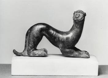 | Keywords: Etruscan - Handle in the Form of a Panther - Walters 541373 - Left.jpg This sinuous animal formed the handle of a lid to a vessel perhaps a situla pail or cista cylindrical container The head is that of a panther while the curve of the body has become so pronounced that it resembles a weasel The Etruscan love of animals inspired their craftsmen to adorn many simple household objects with decorative animal imagery century 5 BC bronze cm 7 9 9 3 2 ; mount cm 2 5 11 5 1 accession number 54 1373 1355 Madame E Warneck Collection Sale Paris Hôtel Drouot 1905 no 257 Henry Walters city Baltimore Walters Art Museum Henry Walters Acquired by Henry Walters 1905 place of origin Italy Walters Art Museum license Etruscan art in the Walters Art Museum Animals in Etruscan art Etruscan bronzes in the United States Leopards in art |