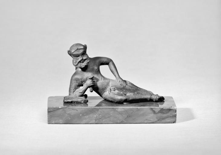 Keywords: Etruscan - Reclining Figure of Silene - Walters 541029.jpg This satyr is a follower of the wine-god Dionysus shown holding a rhyton or drinking-horn in one hand Together with a similar object acc no 54 86 these satyr figures decorated the crosspieces of a wooden tripod ca 500 BC bronze cm 4 1 7 4 2 6 ; mount cm 1 2 9 3 3 8 accession number 54 1029 29947 Henry Walters Baltimore date and mode of acquisition unknown Walters Art Museum Henry Walters Acquired by Henry Walters place of origin Vulci in present-day Italy Walters Art Museum license Etruscan art in the Walters Art Museum Etruscan bronzes in the United States Silenus Sculptures of satyrs |