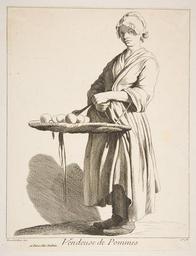 | Keywords: Études prises dans le bas peuple ou les Cris de Paris - Vendeuse de Pommes.jpg Apple Seller Woman seen full-length turned to left carrying apples on a tray 1746 Etching with some engraving image 8 11/16 x 6 15/16 in 22 x 17 7 cm sheet 9 1/8 x 7 in 23 2 x 17 8 cm Institution Metropolitan Museum of Art 3353869 object history exhibition history other versions 399098 Below image on left Bouchardon inv ; centered Vendeuse de Pommes ; on right C S Bottom left A Paris Chés Joullain credit line Harris Brisbane Dick Fund 1953 accession number 53 600 588 58 PD-100 Études prises dans le bas peuple ou les Cris de Paris Etchings of Paris Etchings in the Metropolitan Museum of Art Images of Paris from the Metropolitan Museum of Art Apples in art Vendor's trays in art Street food in Paris |