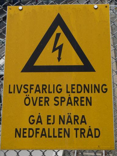 Keywords: EU-SE-Stockholm-Tvärbanan warning.JPG Warning sign at Tvärbanan tramway in Stockholm Sweden Lethal conductor above the tracks Do not go near downed wires Varningsskylt vid Tvärbanan i Stockholm i Sverige Livsfarlig ledning över spåren Gå ej nära nedfallen tråd own Dmitry G 2010-06-01 Electricity warning signs black lighting in yellow triangle Tvärbanan |