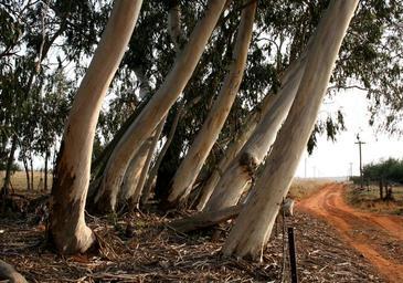 Keywords: eucalyptus bluegum trees trunks thick white slated green leaves light red soil dust road