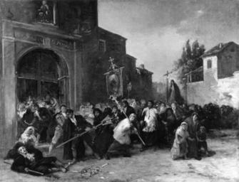 | Keywords: Eugenio Lucas y Padilla - The Procession - Walters 37161.jpg As a religious procession approaches a church a scuffle between two lantern-bearers ensues in which the elder is left sprawled on the ground clutching the shattered shaft of his light Varying degrees of consternation are expressed by onlookers An acolyte struggling with his heavy silver candlestick turns away while a mother clutching her children scurries off to the right Swaying over the throng are a banner a lantern and the pasos of the Via Crucis and the Mater Dolorosa Scholars have attributed this painting to a follower of Lucas rather than to the artist himself noting the picturesque quality of the scene and the lack of vigor in its execution century 19 Oil on canvas cm 67 3 89 accession number 37 161 4185 Henry Walters Baltimore between 1903 and 1909 by purchase Walters Art Museum Henry Walters Acquired by Henry Walters 1903-1909 place of origin Spain Walters Art Museum license 2D Eugenio Lucas Velázquez Processions in art Processional lanterns Media contributed by the Walters Art Museum needs category review Paintings in the Walters Art Museum Media contributed by the Walters Art Museum needs artist update |
