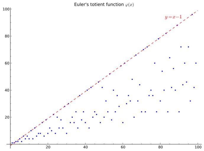 | Keywords: EulerPhi100.svg Sage 6 1 1 Script <pre> P point t euler_phi t for t in srange 1 100 + plot x-1 x 0 100 linestyle -- color red title Euler's totient function \\varphi x + text y x - 1 87 94 color red fontsize 14 P save EulerPhi100 svg transparent True </pre> own User Sverdrup 2014-04-14 Image EulerPhi100 PNG cc-zero Totient function SVG diagrams Order 100 |