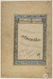 | Keywords: Eulogy to a Ruler WDL2421.png Artwork ru изами Гянджеви 1140 г или 1141 г - 1202 г или 1203 г fr Niẓāmī Ganjavī 1140 ou 1141-1202 ou 1203 en Niẓāmī Ganjavī 1140 or 41-1202 or 3 zh 尼扎米·甘伽维 1140或1141年- 1202或1203年 pt Niẓāmī Ganjavī 1140 ou 1141-1202 ou 1203 ar نظامي الكنجوي 1140 أو 1141-1202 أو 1203 es Niẓāmī Ganjavī 1140/1141 a 1202/1203 ru Панеги ик п авителю fr Panégyrique d'un dirigeant en Eulogy to a Ruler zh 为统治 写的悼词 pt Elogio a um Governante ar تأبين لحاكم ru Данный каллиг афический ф агмент включает цент альную панель на кото ой написана хвалебная ечь ко олю выполненная в стиле висячего ш ифта<em> талик</em> За исключением одной ст оки написанной че ными че нилами все остальные го изонтальные и ве тикальные линии написаны че нилами белого цвета и об исованы по конту у че ными че нилами ад текстовой панелью азделенной на две колонки п иводится <em>бейт </em> стих великого пе сидского поэта изами уме в 1218 году 614 году хидж ы о силе чудес <em>Бейт</em><em> </em>написан че ными че нилами ш ифтом насталик на бумаге бежевого цвета Текстовая панель об амлена синей амкой на кото ой че ными че нилами ш ифтом талик написаны а абские молитвы Вся композиция наклеена на большой лист бумаги бежевого цвета ук ашенный вк аплениями золотого цвета и подк епленный ка тоном В нижнем п авом углу цент альной панели стоит подпись каллиг афа Она гласит аписано бедным и сми енным ста иком-сек ета ем Ихтия аль- унши Ста ик-сек ета ь было п озвищем Камаля аль-Дин Хусейна уме около 1566-1567 гг 974 году хидж ы каллиг афа кото ый вел активную деятельность в годы п авления п едставителя династии Сефевидов Шаха Тахмаспа п авил с 1524 по 1576 год она х оказывал подде жку аботе Камаля аль-Дина в Теб изе и п едлагал ему значительные наг ады от кото ых тот неизменно отказывался а также назначил его своим личным сек ета ем и почетным званием Почтенного ста ца - Ко олевского сек ета я Хотя Камаль аль-Дин был слеп на один глаз он был масте ом всех каллиг афических ш ифтов в особенности масте ски он владел ш ифтом насталик <br>Каллиг афия пе сидская; Иллюмини ование укописей; Исламские укописи; Ко оли и п авители; Чудеса; Письмо насталик; Ш ифт талик fr Ce fragment d'une calligraphie comprend un panneau central avec une éloge écrit au roi écrit dans la pendaison <i> du script de ta'liq</i> Sauf pour une seule ligne à l'encre noire toutes les autres lignes horizontales et diagonales sont écrits en blanc et de noir Au-dessus du panneau de texte apparaît divisée en deux colonnes une <i>bayts</i> verset du grand poète perse Nizami mort en 1218 614 AH sur le pouvoir des miracles Le Bayt est en noir <i>avec un script nasta'liq</i> sur papier beige Autour du texte figure une bordure bleu avec des inscriptions de prières arabes écrites en noir script ta'liq La composition est collée à un grand papier beige décoré de paillettes d'or et soutenu par un support en carton Dans le coin inférieur droit du texte central apparaît la signature du calligraphe On peut y lire Rédigé par les pauvres les humbles les personnes âgées du secrétariat Ikhtiyar al-Munshi les personnes âgées du secrétariat était le surnom de Kamal al-Din Husayn mort en 1566/67 974 AH un calligraphe actif sous le règne du souverain safavide Shah Tahmasp qui a régné en 1524-76 Le monarque a soutenu les travaux de Kamal al-Din à Tabriz et lui a offert un certain nombre de récompenses qu'il a refusé il l'a nommé secrétaire personnel et a employé en ce qui le concerne l'épithète honorifique les personnes âgées du secrétaite royal Même si Kamal al-Din était aveugle d'un oeil il était un maître dans l'art de réaliser des scripts calligraphiques en particulier celui de nasta'liq <br>Calligraphie persane; Enluminures; Manuscrits islamiques; Rois et dirigeants; Miracles; Écriture nastaliq; Écriture Ta'liq en This calligraphic fragment includes a central panel with a eulogy to a king written in the hanging <em>ta'liq</em> script Except for one line in black ink all other horizontal and diagonal lines are written in white and outlined in black Above the text panel appears divided into two columns a <em>bayt</em> verse by the great Persian poet Niẓāmī Ganjavī died 1202 or 1203 about the power of miracles The bayt is in black <em>nasta'liq</em> script on beige paper Around the text panel is a blue border inscribed with Arabic prayers written in black ta'liq script The composition is pasted to a large beige paper decorated with gold flecks and backed by cardboard In the lower right corner of the central text pa