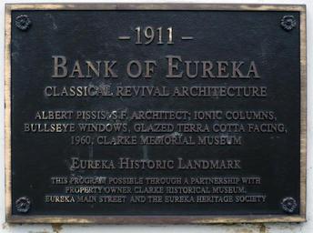 | Keywords: Eureka CA Bank of Eureka Eureka Plaque.jpg en Built in Classical Revival style in 1911 the Bank of Eureka in Eureka California was listed on the National Register of Historic Places in 1982 is a City of Eureka Historical Landmark and is now the Clarke Memorial Museum Eureka Historic Landmark Plaque reads 1911- Bank of Eureka - Classical Revival Architeture - Albert Pissis S F Architect; Ionic Columns Bullseye Windows Glazed Terra Cotta Facing 1960 Clarke Memorial Museum - Eureka Historic Landmark - This program possible through a partnership with property owner Clarke Historical Museum Eureka Main Street and the Eureka Heritage Society own Ellin Beltz 40 48 13 N 124 9 59 W region US 82002180 Bank buildings in California Commercial buildings on the National Register of Historic Places in California 1910s architecture Built in California in 1911 History museums in California Museums in Eureka California Historical markers in Humboldt County California Taken with Panasonic Lumix DMC-FX12Photographs by Ellin Beltz |