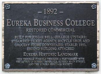 | Keywords: Eureka CA Eureka Business College.jpg en Eureka Historical Building plaque at 430 Second Street Eureka CA Original Photo by Me Ellin Beltz 2012-02-22 Transcription 1 style border-collapse collapse; - align center <B><big> “1892 “ E</big>UREKA <big>B</big>USINESS <big>C</big>OLLEGE RESTORED COMMERCIAL</B> BUILT FOR JOSIAH BELL; COLLEGE UPSTAIRS; STEAMSHIP TICKET AGENCY BICYCLE SHOP AND GROCERY STORE DOWNSTAIRS; STABLE; 1983 SECOND BUILDING ATTACHED <B><big>E</big>UREKA <big>H</big>ISTORIC <big>L</big>ANDMARK</B> <small>THIS PROGRAM POSSIBLE THROUGH A PARTNERSHIP WITH THE ESTATE OF ROBERT IMPERIALE EUREKA MAIN STREET AND THE EUREKA HERITAGE SOCIETY</small> Historical markers in Humboldt County California Taken with Panasonic Lumix DMC-FX12Photographs by Ellin Beltz |