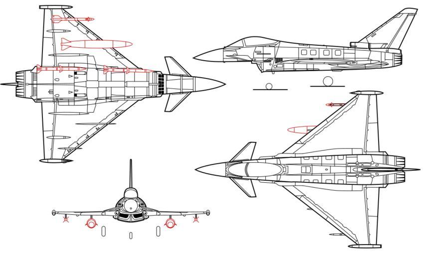 Keywords: Eurofighter Typhoon line drawing.svg Line drawing of a Eurfighter Typhoon showing top bottom side and front views Ordnance is shown in red own 2010-04-13 Inductiveload Eurofighter Typhoon Line drawings of EADS aircraft