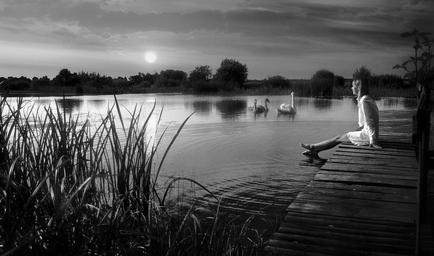 Keywords: evening river sunset lake pond white swan swans bird girl birds feathered neck vacation