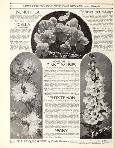 | Keywords: Everything for the garden (15768508084).jpg 102 <br> EVEIRYTMIHG FOIR THE GAEDEH - Fl©w ga <br> NEMOPHILA <br> Splendid annuals about 1 foot high for garden <br> decoration; clusters of bright colored flowers in <br> shades of blue white and violet margined <br> dotted etc borne freely all summer long if <br> grown in a rather cool partially shaded situ- <br> ation Mixed Colors Pkt 5c <br> NIGELLA <br> LOVE-IN-A-MIST <br> Lovely garden annuals growing <br> in oval bush form about 12 to 15 <br> inches in height In the finely cut <br> Fern-like green foliage nestle <br> numerous large double flowers <br> of light blue or white The <br> charming effect having sug- <br> gested the popular names of <br> Love-in-a-Mist Devil-in-a- <br> Bush etc See cut <br> Miss Jekyll Blue An im- <br> proved large-flowering dou- <br> blelight blue variety Pkt 10c <br> Miss Jekyll White A coun- <br> terpart of the above with <br> pure white flowers Pkt 10c <br> Damascena Double Mixed <br> The older tall type Pkt 5c <br> Oenothera 0K r SllS£ <br> These are among our most beautiful plants <br> for mixed garden beds and borders They <br> grow in branching form 1 to 2 feet in height <br> and produce freely and continuously large <br> single Poppy-like flowers of white yel- <br> low rose color etc The blossoms open <br> early every evening and last well into <br> the following day They are of the <br> easiest culture in any sunny situ- <br> ation <br> Mixed Annual Varieties Pkt 5c <br> Oenothera America This new <br> introduction of Mr Luther <br> Burbank is ” he claims ” the <br> largest and best Oenothera in <br> the world It producesin great <br> profusion large flat single <br> flowers 4 to 5 inches across <br> and snowy-white in color <br> It flowers the first season <br> from seed and continues to <br> blocm until killed by frost <br> See cut Pkt 10c <br> Royal Rose A beautiful <br> Mexican Evening Primrose <br> The large single flowers borne <br> in profusion are of a charming <br> rose color Pkt 10c <br> NOVELTIES IN <br> GIANT PANSIES <br> These new European creations are exceedingly beauti- <br> ful ” producing flowers of the largest size and finest form <br> Aureola Lower petals carmine with large blotch upper <br> petals cream-white with broad carmine margin Pkt 15c <br> Morning Dawn A- beautiful Orchid-flowered Pansy <br> vermilion with golden-chamois suffused with flaming <br> red Pkt 15c <br> Mauve Queen Rosy-lavender or mauve with a large <br> bluish-carmine blotch on each of the lower petals <br> Pkt 15c <br> Mercury Velvety blackish-purple very rich and lustrous; <br> the largest of all self-colored Pansies Pkt 15c <br> Psyche Waved and undulated flowers of rich violet- <br> blue broadly edged with clear white Pkt 15c <br> Volcano Bright deep red each petal marked with a <br> large dark blotch flowers waved and frilled Pkt 15c <br> Minerva Bright red each petal marked with a large <br> violet blotch Pkt 15c <br> Solfatara Sulphur or primrose-yellow each petal <br> marked with a large deep blue spot Pkt 15c <br> Collection of Novelties in Giant Pansies 1 pkt each of <br> the above 8 1 00 <br> ' PENTSTEMON <br> Sensation A Giant Gloxinia-flowered type; though <br> perennial they bloom early the first season from <br> spring-sown seed The graceful spikes about 2 feet <br> high are bedecked with flowers two inches across <br> from July until frost The colors and markings are <br> gorgeously varied from pink to scarlet and maroon all <br> beautifully blotched and veined with other colors; a <br> large white throat further enlivens and intensifies <br> the surrounding colors They deserve a prominent <br> place in every garden Pkt 10c <br> Hartwegii Albus A fine new variety and the first pure <br> white Pentstemon The plants are healthy free <br> growers with brilliant green foliage The flower spikes <br> about 2 l A feet high branch out freely from the base and <br> are thickly furnished with large open-throated clear <br> white flowers though in bud and opening they are <br> shaded cream It is a remarkably early and long- <br> blooming variety especially effective in garden beds <br> and borders and when cut the long spikes of white are <br> exquisitely decorative in vases etc See cut Pkt 20c <br> Rocky Mountain Pentstemon P Cyananthus A love- <br> ly and showy species and as hardy as a rock Compact <br> spikes of lovely azure-blue flowers Pkt 15c <br> PEONY <br> Grand hardy herbaceous plants well-known orna- <br> ments of our gardens with large double flowers of various <br> colors; 2 feet high <br> Double Chinese Mixed Colors Pkt 10c <br> Popular <br> Edition <br> 'PICTURESQUE GARDENS by Charles Henderson ;j f -- \ <br> WM HAY WARD Nebraska City Neb <br> 00 postpaid <br> Seepage 199 43874894 149634 78295 Page 102 Text http //www biodiversitylibrary org/page/43874894 c1915 10 5962/bhl title 78295 Henry G Gilbert Nursery and Seed Trade Catalog Collection ; Peter Henderson Co NameFound Albus NameFound Aureola NameFound Cyananthus NameConfirmed Cyananthus EOLID 2878007 NameBankID 3409933 NameFound Damascena NameConfirmed Damascena NameBankID 5119877 NameFound NEMOPHILA NameConfirmed Nemophila Nutt EOLID 70939 NameFound Nigella NameConfirmed Nigella L EOLID 61481 NameFound Oenothera NameConfirmed Oenothera EOLID 11173937 NameBankID 2651297 NameFound Pentstemon NameConfirmed Pentstemon Schmidel EOLID 23988214 NameBankID 8584742 Biodiversity Heritage Library Everything for the garden 1915 Garden Stories Books Bulbs Plants Catalogs Equipment and supplies Flowers Gardening Lawn mowers Seeds U S Department of Agriculture National Agricultural Library bhl page 43874894 dc identifier http //biodiversitylibrary org/page/43874894 bhlGardenStories BHLinbloom bulbs plants u s department of agriculture national agricultural library bhlgardenstories bhlinbloom Information field Flickr posted date ISOdate 2015-01-28 Check categories 2015 August 25 CC-BY-2 0 BioDivLibrary https //flickr com/photos/61