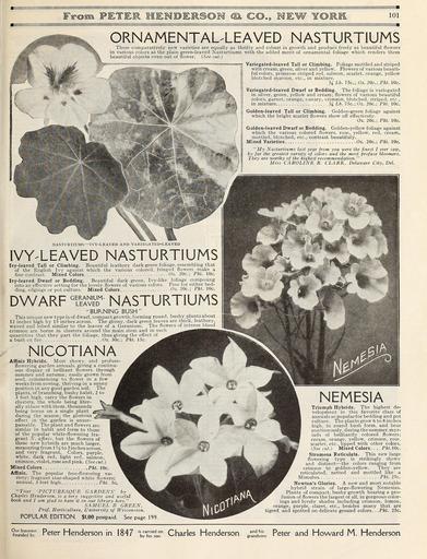 | Keywords: Everything for the garden (15770943433).jpg From PBTEJR 1EMDE1RSOM » CO s NEW YOIRH <br> 101 <br> ORNAMENTAL-LEAVED NASTURTIUMS <br> These comparatively new varieties are equally as thrifty and robust in growth and produce freely as beautiful flowers <br> in various colors as the plain green-leaved Nasturtiums with the added merit of ornamental foliage which renders them <br> beautiful objects even out of flower See cut <br> Variegated-leaved Tall or Climbing Foliage mottled and striped <br> with cream green silver and yellow Flowers of various beauti- <br> ful colors primrose striped red salmon scarlet orange yellow <br> blotched maroon etc in mixture <br> M Lb 75c; Oz 20c; Pkt 10c <br> Variegated-leaved Dwarf or Bedding The foliage is variegated <br> in silver green yellow and cream; flowers of various beautiful <br> colors garnet orange canary crimson blotched striped etc <br> in mixture Lb 75c; Oz 20c; Pkl 10c <br> Golden-leaved Tall or Climbing Golden-green foliage against <br> which the bright scarlet flowers show off effectively <br> Oz 20c; Pkt 10c <br> Golden-leaved Dwarf or Bedding Golden-yellow foliage against <br> which the various colored flowers rose yellow red cream <br> mottled blotched etc -contrast beautifuly <br> Mixed Varieties Oz 20c ; Pkt 10c <br> j – <br> My Nasturtiums last year from you were the finest I ever saw <br> by far the greatest variety of colors and the most profuse bloomers <br> They are worthy of the highest recommendation <br> Miss CAROLINE R CLARK Delaware City Del <br> NASTURTIUMS IVY-LEAVED AND VARIEGATED-LEAVED <br> IVY-LEAVED NASTURTIUMS <br> Ivy-leaved Tall or Climbing Beautiful leathery dark green foliage resembling that <br> of the English Ivy against which the various colored fringed flowers make a <br> fine contrast Mixed Colors Oz 20c; Pkt 10c <br> Ivy-leaved Dwarf or Bedding Beautiful dark green Ivy-like foliage composing <br> into an effective setting for the lovely flowers of various colors Fine for either bed- <br> ding edgings or pot culture Mixed Colors Oz 20c; Pkt 10c <br> DWARF <br> GERANIUM- <br> LEAVED <br> NASTURTIUMS <br> BUKNING BUSH <br> This unique new type is of dwarf compact growth forming round bushy plants about <br> 12 inches high by 15 inches across The glossy dark green leaves are thick leathery <br> waved and lobed similar to the leaves of a Geranium The flowers of intense blood <br> crimson are borne in clusters around the main stem and in such <br> quantities that they part the foliage thus giving the effect of <br> a bush on fire Oz 30c ; Pkt 15c <br> NICOTIANA <br> Affinis Hybrids Most showy and profuse <br> flowering garden annuals giving a continu- <br> ous display of brilliant flowers through <br> summer and autumn; easily grown from <br> seed commencing to flower in a few <br> weeks from sowing thriving in a sunny <br> position in any good garden soil The <br> plants of branching bushy habit <br> 3 feet high carry the flowers in <br> clusters the whole being liter- <br> ally ablaze with them thousands <br> being borne on a single plant <br> during the season; the glorious <br> effect in the garden is unsur- <br> passable The plant and flowers are <br> similar in habit and form to those <br> of the popular white-flowering fra- <br> grant N affinis but the flowers of <br> these new hybrids are much larger <br> measuring from 1 4 to 2 inches across <br> and very fragrant Colors purple <br> white dark red light red salmon <br> crimson violet rose and pink See cut <br> Mixed Colors Pkt 10c <br> Affinis The popular free-flowering va- <br> riety; fragrant star-shaped white flowers; <br> annual 3 feet high Pkt 5c <br> Your 'PICTURESQUE GARDENS' by <br> Charles Henderson is a very suggestive and useful <br> book and I am glad to have it in our library here <br> SAMUEL B GREEN <br> Prof Horticulture University of Wisconsion <br> POPULAR EDITION 1 00 postpaid Seepage 199 <br> NEMESIA <br> Triumph Hybrids The highest de- <br> velopment in this favorite class of <br> annuals so popular for bedding and pot <br> culture The plants grow 6 to 8 inches <br> high in round bush form and bear <br> continuously during the summer myr- <br> iads of brilliantly colored flowers; <br> cream orange yellow crimson rose <br> scarlet etc lipped with other colors <br> See cut Mixed Colors Pkt 10c <br> Strumosa Reticulata This new large <br> flowering type is strikingly showy <br> and distinct ” the colors ranging from <br> crimson to golden-yellow They are <br> reticulated netted and mottled like a <br> Mimulus Pkt 25c <br> Newton's Glories A new and most notable <br> hybrid strain of large-flowering Nemesias <br> Plants of compact bushy growth bearing a pro- <br> fusion of flowers the largest of all in gorgeous color- <br> ings and lovely shades including crimson lemon <br> orange purple claret etc besides many that are <br> tigred and spotted on delicate ground colors Pkt 25c <br> Our business <br> founded bv <br> Peter Henderson in 1847 1° Charles Henderson <br> and his <br> grandsons <br> Peter and Howard M Henderson 43874893 149634 78295 Page 101 Text http //www biodiversitylibrary org/page/43874893 c1915 10 5962/bhl title 78295 Henry G Gilbert Nursery and Seed Trade Catalog Collection ; Peter Henderson Co NameFound Affinis NameConfirmed Affinis NameBankID 5094861 NameFound Mimulus NameConfirmed Mimulus EOLID 103579 NameBankID 4774934 NameFound Nemesia NameConfirmed Nemesia Audouin 1826 EOLID 89014 NameFound Nicotiana NameConfirmed Nicotiana EOLID 11196275 NameBankID 2653638 NameFound Nicotiana affinis NameConfirmed Nicotiana affinis T Moore EOLID 486699 NameBankID 618477 NameFound Reticulata NameConfirmed Reticulata EOLID 11575184 NameBankID 4327865 NameFound Strumosa NameConfirmed Strumosa EOLID 9101673 NameBankID 4356535 Biodiversity Heritage Library Everything for the garden 1915 Garden Stories Books Bulbs Plants Catalogs Equipment and supplies Flowers Gardening Lawn mowers Seeds U S Department of Agriculture Nati