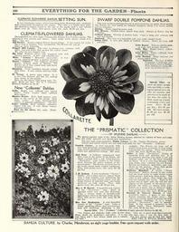 | Keywords: Everything for the garden (15771084383).jpg 160 <br> very <br> CLEMATIS FLOWERED DAHLIA SFTTINCi SUN <br> A very handsome variety of free branching habit flowering early profusely <br> and continuously throughout the season The color is a bright fiery crim- <br> son shading to orange scarlet at the tips of the petals with a rich velvety <br> Eheen over all Price field grown roots 35c each 3 50 per doz <br> CLEMATIS-FLOWERED DAHLIAS <br> Distinguished for their large Clematis like flowers 6 to 8 inches across The <br> coloring is very intense and showy They make noble plants about 5 ft <br> high See cut <br> Ami Barillet Scarlet-crimson flowers bronze foliage A fine variety for mass- <br> ing in beds or borders Very ornamental The flowers are not as <br> large as those following <br> Fringed 20th Century The color is intense rosy crimson with <br> white tips and white disc around the yellow center <br> We offer the new fringed type <br> Big Chief Brilliant cherry red margintd with rich <br> velvety maroon A new and valuable sort <br> White Century Beautiful snow-white <br> strong vigorous grower; a profuse bloomer <br> Scarlet Century The brightest dazzling <br> scarlet without shade or blemish The <br> flowers are of fine round form and finish <br> A profuse bloomer <br> Sensation Vivid Vermillion heavily striped <br> with white A new variety and very strik- <br> ing <br> St George A pretty pure yellow It is <br> a very free bloomer and fine for cutting <br> Very showy in the garden <br> Price for the above field grown roots 25c <br> each 2 50 per doz Set of 7 Clematis- <br> flowered Dahlias for 1 50 <br> New Collarette Dahlias <br> Gallia Bright rose suffused and tipped <br> scarlet Collar creamy white suffused <br> with yellow <br> Maurice Rivoire Rich dark maroon very <br> deep in the center of the petals Pure <br> white collar A large broad-petalled <br> variety of splendid appearance See cut <br> Prince Galitzin Rich crimson collarette <br> tipped with red A very showy variety <br> and quite distinct <br> Price for the above 25c each Field- <br> grown- roots <br> DWARF DOUBLE POMPONE DAHLIAS <br> Tu Th a S type P roduces globular flowers in great profusion on rather dwarf plants <br> ihe flowers are very useful for summer bouquets about 2 in across pretty <br> and not obtrusive <br> Alewine Flesh edged lavender pink <br> Allie Mourey Pinkish-white tipped deep pink Always in flower fine for <br> cutting <br> Crimson Queen Flowers of perfect form Color a deep rich crimson full <br> and very double <br> Daybreak The color is a beautiful soft rosy pink shaded blush <br> Indian Chief A very rich shade of reddish crimson Stems are long stiff <br> and wiry <br> Little Beauty Delicate shrimp pink <br> an early and profuse bloomer <br> Little May Bright lemon yellow; <br> a beautiful sort <br> Little Helen White suffused with <br> blush; very pretty <br> Little Herman Deep lustrous red <br> petals tipped white <br> Snowclad The best of white <br> Pompones Completely cov- <br> ered with a mass of flowers <br> Price field-grown roots 20c <br> each; set of 10for 1 75 <br> ETTE <br> Special Offer As <br> there are many people <br> who care little or noth- <br> ing for special sorts we <br> offer our selection said <br> selection to be made at <br> the time the order is <br> filled made up of good <br> contrasting colors and <br> sorts Price 1 50 <br> per doz ; 12 00 per <br> 100 All colors mixed <br> 1 00 per doz 8 00 <br> per 100 <br> THE PRISMATIC COLLECTION <br> OF SPLENDID DAHLIAS <br> We group together eight of the finest Dahlias known selected for variety of form and color <br> Ihey are really splendid and should give satisfaction <br> Our new eight page pamphlet Dahlia Culture by Mr Charles Henderson giving <br> history and culture will be sent free with each order for the Prismatic Collection <br> Gondola Cactus A clear rosy-pink with sunlight The flowers are large and of <br> perfect form borne profusely on long stems; <br> a grand sort for cutting Price field grown <br> roots 30c each 3 00 per doz <br> Delice A large Decorative Dahlia of <br> beautiful form and splendid size It is <br> an exquisite glowing rose pink a soft yet <br> brilliant color one of the most beautiful <br> we know It is a very free bloomer with <br> long stems very valuable for cut flowers <br> Retains its freshness splendidly also very <br> showy in the garden Price field grown <br> roots 35c each 3 50 per doz <br> Professor Mansfield A grand Fancy <br> Decorative Dahlia; flowers on the crown <br> bud run from seven to eight inches across <br> sturdy grower with long stout stems The <br> color is rich yellow clear white tips and <br> rosy-red towards the center Early in the <br> season and in light soils the red will also <br> appear on the margin of the petals; occa- <br> sionally the white is absent from some <br> flowers on a plant but in whatever stage <br> it is a unique and handsome variety Price <br> field grown roots 35c each 3 50 per doz <br> Souvenir de Gustive Douzon A truly <br> wonderful variety a giant in size some <br> flowers reaching ten inches across The <br> color is an intense shade of orange-red with <br> rich crimson shadings It is a broad- <br> petaled Decorative and of splendid <br> form It has created a sensation in the <br> Dahlia world Price field-grown roots <br> 35c each 3 50 per doz <br> very large gracefully arranged flowers with <br> long narrow peculiarly twisted petals Fine <br> stems and splendid for cutting 40c each <br> Jack Rose A brilliant crimson-red with <br> fiery tones in the center of the flower the <br> whole overlaid with a soft violet-maroon <br> Decorative type double to the center <br> never showing the yellow stamens or im- <br> mature green The flowers are from five to <br> six inches across under normal conditions <br> Price field grown roots 35c each 3 50 <br> per doz <br> J H Jackson A very handsome Cactus <br> Dahlia jolor a deep maroon almost bla