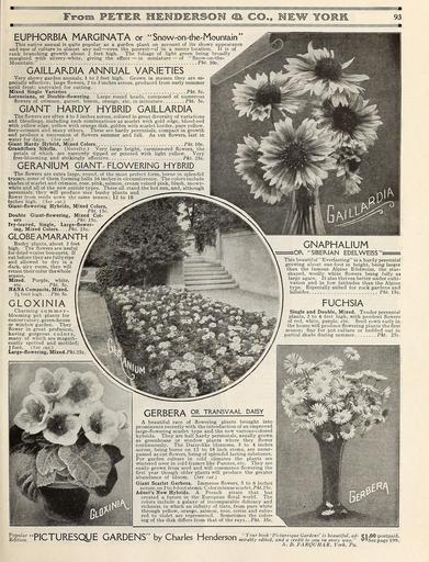 | Keywords: Everything for the garden (16203315608).jpg Ff DKim FETEIR HEMDEIRSOM EL CO MEW Â¥OM <br> 93 <br> EUPHORBIA MARGINATA or Snow-on-the-Mountain <br> This native annual is quite popular as a garden plant on account of its showy appearance <br> and ease of culture in almost any soil ” even the poorest ” if in a sunny location It is of <br> rank branching growth about 2 feet high The foliage of light green being broadly <br> margined with silvery-white giving the effect ” -in miniature ” of Snow-on-the- <br> Mountain Pkt 10c <br> GAILLAKDIA ANNUAL VARIETIES <br> Very showy garden annuals 1 to 2 feet high Grown in masses they are es- <br> pecially effective; large flowers 2 to 3 inches across produced from early summer <br> until frost; unrivaled for cutting <br> Mixed Single Varieties Pkt 5c <br> Lorenziana or Double-flowering Large round heads composed of numerous <br> flowers of crimson garnet lemon orange etc in miniature Pkt 5c <br> GIANT HARDY HYBRID GAILLARDIA <br> The flowers are often 4 to 5 inches across colored in great diversity of variations <br> and blendings including such combinations as scarlet with gold edge blood-red <br> with yellow edge yellow with orange disk golden with scarlet border pure yellow <br> fiery-crimson and many others These are hardy perennials compact in growth <br> and produce a succession of flowers summer and fall As cut flowers last in <br> water for days See cut <br> Giant Hardy Hybrid Mixed Colors Pkt 10c <br> Grandiflora Sibylla Novelty Very large bright carmine-red flowers the <br> petals of which are narrowly tipped or pointed with light yellow Very <br> free-blooming and strikingly effective Pkt 25c <br> GERANIUM GIANT FLOWERING HYBRID <br> The flowers are extra large round of the most perfect form borne in splendid <br> trusses some of them forming balls 16 inches in circumference The colors include <br> shades of scarlet and crimson rose pink salmon cream veined pink blush snowy- <br> white and all of the new auriole types These all stand the hot sun and although <br> perennials they will produce nice bushy plants and <br> flower from seeds sown the same season; 12 to 18 <br> Inches high See cut <br> Giant-flowering Hybrids Mixed Colors <br> Pkt 15c <br> Double Giant-flowering Mixed Col- <br> ors Pkt 25c <br> Ivy-leaved Single Large-flower- <br> ing Mixed Colors Pkt 25c <br> GLOBE AMARANTH <br> Bushy plants about 2 feet <br> high The flowers are useful <br> for dried winter bouquets If <br> cut before they are fully ripe <br> and allowed to dry in a <br> dark airy room they will <br> retain their color the whole <br> season <br> Mixed Purple white <br> etc Pkt 5c <br> NANA Compacta Mixed <br> 4 foot high Pkt 5c <br> GLOXINIA <br> Charming summer- <br> blooming pot plants for <br> conservatory green-house <br> or window garden They <br> flower in great profusion <br> having gorgeous colors <br> many of which are magnifi- <br> cently spotted and mottled <br> 1 foot See cut <br> Large-flowering Mixed Pfei 25c <br> GNAPHALIUM <br> -OR SIBEKIAN EDELWEISS <br> This beautiful Everlasting is a hardy perennial <br> growing about one foot in height being larger <br> than the famous Alpine Edelweiss the star- <br> shaped woolly white flowers being fully as <br> large again It also thrives better under culti- <br> vation and in low latitudes than the Alpine <br> type Especially suited for rock gardens and <br> hillsides Pkt 15c <br> FUCHSIA <br> Single and Double Mixed Tender perennial <br> plants 2 to 4 feet high with pendent flowers <br> of red white purple etc Seed sown early in <br> the house will produce flowering plants the first <br> season; fine for pot culture or bedded out in <br> partial shade during summer Pkt 25c <br> GERBERA OR transvaal daisy <br> A beautiful race of flowering plants brought into <br> prominence recently with the introduction of an improved <br> large-flowering scarlet type and the new various-colored <br> hybrids They are half hardy perennials usually grown <br> as greenhouse or window plants where they flower <br> continuously The Daisy-like blossoms 3 to 4 inches <br> across being borne on 12 to 18 inch stems are unsur- <br> passed as cut flowers being of splendid lasting substance <br> For garden culture in cold climates the plants are <br> wintered over in cold frames like Pansies etc They are <br> easily grown from seed and will commence flowering the <br> first year though older plants will produce the greater <br> abundance of bloom See cut <br> Giant Scarlet Gerbera Immense flowers 5 to 6 inches <br> across on 2 to 3-foot stems Color intense scarlet Pkt 2 5c <br> Adnet's New Hybrids A French strain that has <br> created a furore in the European floral world The <br> colors include a galaxy of incomparable delicacy and <br> richness in which an infinity of tints from pure white <br> through yellow orange salmon rose cerise and ruby- <br> red to violet are represented Sometimes the color- <br> ing of the disk differs from that of the rays Pkt 35c <br> Popular <br> Edition <br> PICTURESQUE GARDENS by Charles Henderson J £ 2 tf V B'g£ – <br> A B FARQUHAR York Pa <br> t 1 00 postpaid <br> «P1 See page 199 43874885 149634 78295 Page 93 Text http //www biodiversitylibrary org/page/43874885 c1915 10 5962/bhl title 78295 Henry G Gilbert Nursery and Seed Trade Catalog Collection ; Peter Henderson Co NameFound Compacta NameConfirmed Compacta EOLID 10934908 NameBankID 2627020 NameFound Euphorbia marginata NameConfirmed Euphorbia marginata EOLID 1144444 NameBankID 2651828 NameFound Gaillardia NameConfirmed Gaillardia Foug EOLID 38325 NameFound Gerbera NameConfirmed Gerbera EOLID 60453 NameBankID 2676014 NameFound Gloxinia NameConfirmed Gloxinia L'Her EOLID 72184 NameFound Gnaphalium NameConfirmed Gnaphalium EOLID 59452 NameBankID 2658074 NameFound Grandiflora NameFound Lorenziana NameConfirmed Lorenziana NameBankID 5328378 NameFound Sibylla NameConfirmed Sibylla EOLID 10138 NameBankID 4342936 Biodiversi