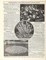 | Keywords: Everything for the garden (16203324348).jpg – iiiiii <br> 98 <br> ;Â¥E1Â¥TH1MG FOM TIE GAR1EM - Flower Seeds <br> MARVEL OF PERU Four ° clocks <br> Beautiful summer-blooming annuals of bushy habit 2 feet <br> high each plant bearing throughout the summer hundreds of <br> large flowers of white yellow crimson or striped Mixed <br> Colors Oz 20c Pkt 5c <br> Variegated Foliage Mixed Colors Foliage striped and <br> marked with silver gold etc Oz 20c Pkt Sc <br> MATRICARIA snowball <br> This splendid variety of M alba plenissima or Double <br> White Feverfew forms bushy annual garden plants bearing <br> quantities of pure snow-white double flowers in dense clusters <br> almost covering the oval plants with bloom; height 8 inches <br> Very desirable for bedding and fine for cutting Pkt 10c <br> MIGNONETTE <br> Red Goliath One of the finest being of strong growth healthy <br> and deep-rooting The average spikes of flowers are im- <br> mense measuring 6 to 8 inches long by 21-2 inches in diam- <br> eter and are compactly filled with giant florets measuring <br> /2 inch across and packed full even in the center with an- <br> thers or three times as many as the older Mignonettes con- <br> tain consequently this variety is correctly called a double <br> Mignonette The color of the florets ” 'fire-red ” is strength- <br> ened on account of the density of the florets and spikes thus <br> presenting almost solid columns of brilliant red effectively <br> contrasted against the healthy rich green foliage The fra- <br> grance is delightfully rich and powerful For cutting it is <br> perfection remaining fresh for 8 to 10 days in water Per <br> 1 000 seeds 50c; Per J4 Oz 1 00 Pkt 10c <br> White Goliath The double white-flowering counterpart of <br> the splendid Red Goliath offered above Pkt 15c <br> Machefs Perfection This improved popular Mignon- <br> ette produces broad cone-shaped spikes of very <br> fragrant red flowers on strong and graceful <br> stems dressed with vigorous foliage evenly <br> branched and of continuous-blooming habit <br> much the superior of its type; one of the <br> best for either garden or pot culture Per <br> 1 000 seeds 30c Pkt 10c <br> Bird's Mammoth A most popular variety <br> – ” 'producing long spikes and well filled <br> with large fragrant flowers throughout <br> the season Per 1 000 seeds 25c <br> Pkt 10c <br> Allen's Defiance A splendid variety <br> for greenhouse culture long spikes <br> of flowers Pkt 15c <br> Mignonette Large-flowering The <br> popular fragrant garden annual <br> Oz 20c Pkt 5c <br> MIMULUS <br> Tigrinus Dwarf bushy plants; 1 foot <br> high with large Gloxinia-like flowers <br> of various colors Mixed Colors <br> Spotted and mottled Pkt 10c <br> Moschatus Musk Plant Hfoot; fra- <br> grant foliage; yellow flowers Pkt 5c <br> A WILD FLOWER GARDEN <br> may be had in any suitable out of the way <br> place ” -by sowing broadcast and raking in Hen- <br> derson's Special Mixed Flower Seeds for Wild Gar- <br> dens at the rate of 1 oz per 100 square feet mixed <br> with sand or dry soil for ease of distribution Price <br> 15c per oz ; 50c per J lb ; SI 50 per lb postpaid <br> MOMORDICA <br> Balsamina Balsam Apple Annual climber; <br> 15 feet bearing ornamental orange-colored <br> fruits with red interiors Pkt 5c <br> Morning Glories <br> Convolvulus major Annual climbers; <br> 30 to 50 feet high Mixed Colors <br> Oz 15c Pkt 5c <br> i Bush Morning Glories <br> i fif - mSRt ' ;S ft \ Convolvulus minor Fine bushy plants; <br> 12 inches high by 2 feet in diameter <br> bearing profusely medium - sized <br> KfcetalBl f Morning Glory flowers See cut <br> Mixed Colors Oz 20c Pkt 5c <br> MUSA ENSETE <br> ABYSSINIAN BANANA <br> A sub-tropical foliage plant very decc <br> rative in pots or tubs or bedded out; 10 <br> to 15 feet Pkt 25c <br> MYOSOTIS or oYs <br> Popular perennials flowering the first season <br> from early spring-sown seed See cut <br> Ruth Fischer This splendid Forget-me-not is of <br> compact habit with glossy dark green foliage above <br> which are carried on sturdy stems large clusters of <br> immense pure Forget-me-not blue flowers \Yi inches <br> across or larger than those of any other known Myosotis The <br> plants of unusual hardiness withstanding zero weather are <br> in consequence especially valuable for spring bedding effects <br> They also make fine pot plants forcing easily Pkt 15c <br> Argentina The first sub-variety obtained from the famous <br> Myosotis Ruth Fischer described above which exactly <br> describes Argentina ” excepting that the latter is bespangled <br> with glistening silvery-white flowers half an inch and over <br> across such as are not found in this size and perfection in <br> any other Forget-me-not Pkt 25c <br> Triumph A robust-growing large-flowering Forget-me-not <br> It commences to bloom in from 6 to 8 weeks from seed-sow- <br> ing and continues to bloom until checked by frost The <br> individual flowers are large and are borne in clusters on <br> long graceful stems rendering them very useful for cutting <br> Color bright turquoise-blue with yellow eye Pkt 10c <br> Palustris Large-flowering Dark blue; 1 foot 10c <br> Distinction Quick-and-Ever-Flowering This type begins <br> to flower in from 8 to 10 weeks' time from sowing The <br> plants are of round bushy form; 5 to 7 inches high per- <br> fectly covered with clusters of flowers <br> Blue Pkt 10c <br> Victoria Grand Forget-Me-Nots forming round compact <br> bushes about 8 inches high covered with clusters of large <br> flowers <br> Blue Pkt 10c <br> Mixed Colors 10c <br> NEW DOUBLE- MYO'sPlTK <br> FLOWERING ' 1 » \J3\J 1 1J <br> A variety of the pyramidal growing Alpine Forget-me-not <br> bearing in profusion clusters of double light blue flowers the <br> individual flowers being formed of several whorls of petals <br> which retain their freshness for an unusually long time; <br> height 8 to 9 inches Pkt 25c <br> HENDERSON'S Choi
