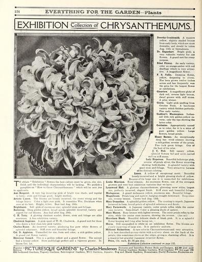 | Keywords: Everything for the garden (16203461188).jpg 154 <br> EXHIBITION collection of CHRYSANTHEMUMS <br> TO obtain Exhibition flowers the best culture must be given else size <br> finish and the individual characteristics will be lacking We publish a <br> pamphlet on How to Grow Chrysanthemums which will be sent free <br> to applicants <br> Ami Bergeret A very big incurving pink of bright rose shade and regular <br> in form; stem and foliage good; height medium <br> Artistic Queen The blooms are loosely incurved the stems strong and the <br> foliage heavy Color a light rose pink It resembles Wm Duckham when <br> seen at its best Height 4 feet Best bud Aug 10th <br> Brighthurst Soft pink of enormous size; splendid stem and foliage <br> Buttercup Deep golden yellow broad petals splendid incurved variety and <br> superb for cut blooms Any bud after Aug 20th <br> C H Totty A glowing chestnut scarlet; flower stem and foliage are alike <br> enormous A fine exhibition variety <br> Chadwick Supreme A pink sport of W H Chadwick A grand sort for those <br> who desire a first class late pink variety <br> Charles Razer An incurved variety producing fine pure white flowers of <br> splendid substance Stiff stem and beautiful foliage <br> Col D Appleton Unexcelled for size form and color; a rich golden yellow_ <br> A grand cut flower variety <br> Directeur Gerard This is a golden yellow and a grand flower The second <br> bud a bronzy yellow Stem and foliage perfect and a vigorous grower In <br> bloom Oct 1st <br> Dorothy Gouldsmith A massive <br> yellow slightly shaded bronze <br> from early buds which are most <br> desirable and should be taken <br> Aug 15th or thereabouts <br> Dr Enguehart Bright pink; a <br> very valuable variety for cut <br> flowers A grand sort for every <br> purpose <br> Ethel Fitzroy An early variety <br> color an orange-amber with red <br> shadings which is very attrac- <br> tive A magnificent flower <br> F S Vallis Immense flower <br> yellow deepening to citron <br> Has been grown twelve inches <br> across and has frequently won <br> the prize for the largest flower <br> at exhibitions <br> Glenview A magnificent globe of <br> dark red; reverse light bronze <br> dwarf grower with stiff stems <br> A prize winner <br> Gloria Light pink seedling from <br> October Frost A handsome <br> variety which finishes perfectly <br> Fine early variety <br> Godfrey's Masterpiece Indian- <br> red with rich golden-yellow re- <br> verse only the tips showing the <br> latter color <br> Goldmine Appropriately named <br> as to color for it is a mine of <br> pure golden yellow Large <br> flowers broad petals <br> Henry Barnes An exceptionally <br> deep but vivid crimson showing <br> a rich golden reverse of the petals <br> Fine dark green foliage One of <br> the best of its color <br> J C Neil Soft canary yellow <br> splendid flowers full and solid carried <br> well on stiff stems <br> Lady Hopetoun Beautiful heliotrope pink <br> reverse of petals silver the flower recurving <br> showing both shades A splendid variety with <br> good stem and foliage Very attractive because <br> of its distinct coloring <br> Lenox A yellow of exceptional merit Beautiful <br> loosely incurved and a bright pleasing shade of yellow <br> Because of its large size it is unexcelled for exhibitions <br> Leslie Morrison Rosy crimson An enormous flower one of the strongest <br> growers and very best exhibition varieties that we have <br> Lynnwood Hall A glorious chrysanthemum glistening snow white largest <br> size perfectly incurved elegant finish Stiff stem and beautiful foliage <br> Madagascar A grand midseason yellow enormous size Beautiful foliage <br> Magnificent Petals long and narrow hanging straight downward Deep crim- <br> son reverse bronze Crown bud Aug 15th <br> Mary Donnellan A splendid golden yellow The coloring is superb Japanese <br> incurved in form broad petals of splendid substance and finish <br> Mary Farnsworth A Japanese variety outer petals reflex while the center <br> ones incurve Semi-dwarf Color a pleasing shade of apricot <br> Mary Mason Rosy bronze with lighter reverse The outer petals reflex to the <br> stem while the center ones incurve showing the reverse See cut <br> Merstham Blush Beautiful delicate shade of blush pink It is a splendid <br> flower keeping well long after being cut ˘- <br> Merza Still unequalled in white as an exhibition flower The blooms are <br> c'osely incurving of large size It is perfectly uniform <br> Millicent Richardson A rare color in Chrysanthemums and very attractive <br> It is best described as rosy-violet with a silvery sheen on the back of the <br> petals; this sometimes shows at the edges giving a charming effect It is <br> a massive but graceful Japanese recurved flower <br> Price 15c each SI 50 per doz <br> Exhibition Collection continued on page 155 <br> Edition PICTURESQUE GARDENS by Charles HenderSOn - desc s Flower Bed»_and Designs <br> Cjj 00 post paid <br> Old fashioned Gardens Topiary Gardens Sub-tropical Gardens <br> ormal Gardens Sunken Gardens Wall Gardens See page 199 <br> Wild Gardens Aquatic Bog and Marsh GardenSi Roseariums Hardy Ferneries Rockeries etc 43874946 149634 78295 Page 154 Text http //www biodiversitylibrary org/page/43874946 c1915 10 5962/bhl title 78295 Henry G Gilbert Nursery and Seed Trade Catalog Collection ; Peter Henderson Co Biodiversity Heritage Library Everything for the garden 1915 Garden Stories Books Bulbs Plants Catalogs Equipment and supplies Flowers Gardening Lawn mowers Seeds U S Department of Agriculture National Agricultural Library bhl page 43874946 dc identifier http //biodiversitylibrary org/page/43874946 bhlGardenStories BHLinbloom bulbs plants u s department of agriculture national agricultural library bhlgardenstories bhlinbloom Information field Flickr posted date ISOdate 2015-01-28 Check categories 2015 August 25 CC-BY-2 0 BioDivLibrary https //flickr com/photos/61021753 N02/16203461188 2015-08-25 02 