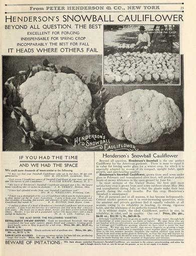Keywords: Everything for the garden (16204921607).jpg Frosmi FETEM MEHPEIRSOM ® C© ž HEW YOM <br> 25 <br> Hendersons SNOWBALL CAULIFLOWER <br> BEYOND ALL QUESTION THE BEST <br> EXCELLENT FOR FOKCING <br> INDISPENSABLE FOR SPRING CROP <br> INCOMPARABLY THE BEST FOR FALL <br> IT HEADS WHERE OTHEKS FAIL <br> IF YOU HAD THE TIME <br> AND WE HAD THE SPACE <br> We could quote thousands of letters similar to the following <br> I may say that your Snowball Cauliflower came up in five days 98 per cent <br> germinating GEO M DICKSON Leominster Mass <br> Last season I bought two ounces of Snowball Cauliflower at your store and grew <br> over ISO barrels of fine Cauliflower WALTER KNOPP Ramsay N J <br> My patch of Henderson's Snowball Cauliflower averaged over 5 lbs the largest <br> beine something over 13 inches in diameter J E THREFT Bristow Okla <br> I have had splendid results from your Snowball Cauliflower seed <br> Mrs H C WHELLAMS Winnipeg Can <br> I mail you a photograph of the case of Cauliflower which won the highest award ” –  <br> a silver medal ” at the St Louis Exposition 1 grew it from your Snowball seed <br> For reliability of heading fine texture and whiteness of curd I have never grown any <br> Cauliflower that equals it R E HISTED South Haven Conn <br> I enclose a photo of a head of Henderson's Snowball Cauliflower which weighed <br> 4 pounds I have tried five varieties of Cauliflower and find none that compares <br> with yours The heads are so much whiter harder and more perfect inform than <br> others Besides it has not got a granulated surface like many others and is much <br> earlier in maturing Dr E A LEE Jennings La <br> WE ALSO OFFER THE FOLLOWING VARIETIES <br> EXTRA-EARLY DWARF ERFURT Until we introduced Snowball this - was <br> considered the best early variety; plaats dwarf and compact forming good- <br> sized heads; sown in May is good for a fall crop Price 20c pkt 3 25 oz <br> 10 00 M lb- <br> EXTRA-EARLY PARIS Heads uniform and of medium size Price 10c pkt <br> 80c oz 2 75 4 lb <br> LARGE LATE ALGIERS A strong-growing variety for late fall use producing <br> large fine heads Price 10c pkt 75c oz 2 50 M lb <br> Henderson's Snowball Cauliflower <br> Beyond all question Henderson's Snowball is the one perfect <br> Cauliflower for the American gardener There is none to equal it <br> in value for forcing under glass for a winter crop for which it is <br> especially adapted by reason of its compact upright habit quick <br> growth and sure-heading quality <br> Henderson's Snowball Cauliflower grown from seed sown under <br> glass in February and transplanted after frost will produce perfect <br> heads of snowy whiteness in the open ground by June 1st <br> In most sections of the United States the best and most <br> satisfactory crop is grown from seed sown outdoors about May 20th <br> and transplanted during July so that the plants make their best <br> growth during the cooler months For this crop Henderson's <br> Snowball is unsurpassed <br> For all purposes and at all seasons it has become indispensable <br> Critical market growers use it in ever-increasing quantities while <br> the amateur and private gardener find it equally valuable at all <br> seasons owing to its reliability in heading its strong vigorous <br> habit and the whiteness of its perfectly-formed flowers <br> It is without doubt the ideal Cauliflower perfect in size in <br> reliability in color and in quality See cut Price 25c pkt <br> 4 00 oz 12 50 H lb 45 00 lb <br> Although Cauliflower may be grown as easily as Cabbage many through lack <br> of knowledge of some essentials are liable to failure We urge those who are <br> not familiar with its cultivation to read carefully the pamphlet we have prepared <br> on Cabbage and Cauliflower growing wherein we have tried to point the way <br> to success We may say here briefly that success depends on growing a large <br> plant and that as Cauliflower is essentially a cool weather plant this cannot be <br> done in the hot summer months; therefore the earliest outdoor crop must be <br> grown from seed sown under glass in February so that the crop will mature by <br> June 1st; for fall use it should be sown late in May so that the best development <br> may be made during the cooler weather of September and October <br> BEWARF OF I II I A I lOI JS e bave always controlled Henderson's Snowball Cauliflower any statement to the contrary notwithstanding and unless the <br> /\I\L_ \ /l 11 11 1 r i 1 l yi U seec j j s b OU g nt directly from us you do not get the genuine as we do not supply it to dealers 43874817 149634 78295 Page 25 Text http //www biodiversitylibrary org/page/43874817 c1915 10 5962/bhl title 78295 Henry G Gilbert Nursery and Seed Trade Catalog Collection ; Peter Henderson Co Biodiversity Heritage Library Everything for the garden 1915 Garden Stories Books Bulbs Plants Catalogs Equipment and supplies Flowers Gardening Lawn mowers Seeds U S Department of Agriculture National Agricultural Library bhl page 43874817 dc identifier http //biodiversitylibrary org/page/43874817 bhlGardenStories BHLinbloom bulbs plants u s department of agriculture national agricultural library bhlgardenstories bhlinbloom Information field Flickr posted date ISOdate 2015-01-28 Check categories 2015 August 25 CC-BY-2 0 BioDivLibrary https //flickr com/photos/61021753 N02/16204921607 2015-08-25 03 00 43 cc-by-2 0 PD-old-70-1923 Everything for the garden 1915 Photos uploaded from Flickr by Fæ using a script