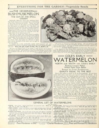 Keywords: Everything for the garden (16364874846).jpg 42 <br> EVERYTHING FOIR TIE GA1RDEH <br> THE HENDERSON <br> BUSH MUSK MELON <br> THE GEM OF THE SMALL <br> GARDEN <br> Radically different from any existing kind <br> The bush character is attained by a shortening <br> of the stem between the joints There are just <br> as many leaves on the plant as on other kinds <br> but these grow so compactly that the plant can <br> be grown on one-half the space usually required <br> Notwithstanding its radical departure from ex- <br> isting types it is by no means a freak its freedom <br> from variation has been too constant over the <br> entire time of our observance of it <br> The fruit is small but fully equal in quality <br> to the old and justly esteemed Jenny Lind which <br> is probably the best flavored of all green-fleshed <br> sorts They are produced in abundance in fact <br> we advise that each plant be allowed to ripen <br> only about one-half of the fruit as it is apt to <br> bear too many <br> It delights in a rich preferably sandy well manured soil and <br> responds favorably to frequent applications of water during drought <br> See cut Price iSc pkt 4 pkts for 50c 75c oz 2 50 34 lb <br> We never grew Melons before as our garden is small but last year we put in <br> a few hills of your Bush Musk Melon 3 feel apart and followed your directions <br> with gratifying results We allowed four plants to the hill and their average yield <br> was 15 Melons to the hill all as sweet and delicious as the best Melon we ever <br> tasted V R METZ Closter N J <br> The people are wild about my Bush Musk Melons They are certainly a sight <br> to see for on many of the hills the Melons are piled up in clusters; on one there <br> were six all in a bunch The vines are healthy and full of blossoms and if we get <br> some rain there will be a great yield <br> DUBOIS BRINCKERHOFF De Wint Street Beacon N Y <br> Your 'Henderson' Bush Musk Melons aroused the curiosity of all who saw <br> them ” so different were they in habit of growth from the vine Melons that many <br> people could not believe they were Melons until the fruit appeared I could plant <br> twice as many hills on the same plot of ground which was a great advantage <br> A J SCRIVENS North Hackensack N J <br> COLE'S EARLY <br> WATERMELON <br> NORTH rivals SOUTH with COLE'S EARLY <br> Produces Luscious Melons <br> Where None Grew Before <br> Surest in Crop Production <br> QUALITY EQUAL TO THE BEST <br> This is the easiest to grow of all the Watermelons If you have <br> failed with other sorts you can succeed with Cole's Early It is <br> the best variety for the family garden primarily so on account of <br> its extreme earliness but mainly because it has all the qualities <br> necessary to a perfect variety for this purpose Its remarkably <br> early character entirely removes the most common hindrance to <br> its cultivation As far north as Canada and in places where <br> Watermelons never grew before Cole's Early is now supplying <br> the tables of those who grow it just as bountifully and with just as <br> good Melons as in the sunny regions of the South <br> It is good in every respect producing a liberal crop of Melons <br> twelve inches long and nine inches in diameter not large but in <br> abundance and of delicious quality The deep red fine grained <br> flesh ripens from heart to rind while its rich color and luscious <br> flavor are tempting to the most exacting and critical taste See <br> cut Price 10c pkt 15c oz 35c Y± lb 1 00 lb <br> Your Cole's Early Watermelons are better than you said they were I raised <br> several last year that weighed over 20 pounds each and they were two weeks earlier <br> than any other kind I had E B KEATHLEY Kenton Tenn <br> Cole's Early Watermelons were of the best quality and also very productive <br> V M BROWN East Moravia Pa <br> GENERAL LIST OF WATERMELONS <br> loz for <br> CITRON Red seeded Small round fruits for preserves only Price 5c <br> pkt 10c oz 30c H lb 90c lb <br> CUBAN QUEEN Large oval Melons; striped dark and light green; flesh red <br> and of excellent quality; the best late sort Price 5c pkt 10c oz 30c <br> lb 85c lb <br> FLORIDA FAVORITE One of the best of the long oval Melons attaining <br> enormous size; succeeding further north than other large varieties; rind thin <br> but hard mottled light and dark green; flesh clear crimson Price 5c pkt <br> 10c oz 30c f lb 85c lb <br> ICE CREAM White-seeded A medium-sized almost round Melon suc- <br> ceeding well in the North Skin light green faintly mottled; flesh scarlet <br> and solid Price 5c pkt 10c oz 30c 1 i lb 85c lb <br> KLECKLEY'S SWEETS An oval-shaped variety with dark green skin and <br> thin rind The bright scarlet flesh is extremely sweet Price 5c pkt 10c <br> oz 30c li lb 85c lb <br> SO hills <br> KOLB'S GEM The fruit is nearly round rind dark green somewhat marbled <br> with lighter shades Weight 25 to 50 lbs Price 5c pkt 10c oz 25c M <br> lb 75c lb <br> MAMMOTH IRON CLAD An old and popular variety; grows to an immense <br> size; oval dark green with light markings; red flesh of fine quality Price <br> 5c pkt 10c oz 25c li lb 75c lb <br> MOUNTAIN SWEET An old favorite; oval dark green fruits rind thin; <br> flesh red solid and sweet Price 5c pkt 10c oz 25c H lb 75c lb <br> SWEET HEART An early oval-shaped Melon light green mottled with <br> thin tough rind; flesh light red solid of fine quality and flavor Price 5c <br> pkt 10c oz 30c H lb 85c lb <br> SWEET SIBERIAN HENDERSON'S Splendid for northern climates Flesh <br> deep orange-buff and very sweet early and productive Price 10c pkt <br> 15c oz 40c M lb 1 25 lb <br> TOM WATSON Long oval shape thin but tough rind; bright scarlet flesh <br> excellent quality Price 5c pkt 10c oz 30c 1 j lb 85c lb <br> Our business <br> founded by <br> Peter Henderson in 1847 is T v Kn on Charles Henderson ž r a a n i Peter and Howard M Henderson <br> grandsons ' 43874834 149634 78295 Page 42 Text 