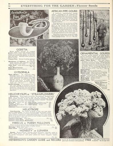 Keywords: Everything for the garden (16389202751).jpg R THE GAIRDEH - F <br> AFRICAN PIPE GOURD <br> A luxuriant rapid-growing annual <br> climber adaptable to all purposes for <br> which climbing plants are used ; and be- <br> sides it produces the Ornamental Gourds <br> from which are made the African Cala- <br> bash pipes now so popular on account of <br> their lightness grace and meerschaum <br> coloring qualities <br> When grown for the production of Pipe <br> Gourds the vines are usually allowed to <br> grow on the ground like Cucumbers <br> Pumpkins etc so that the fruits in place <br> of hanging down and growing straight <br> will take their natural pipe curve; though <br> if grown on trellis the Gourds may be <br> shaped by tying up with cheese cloth or <br> by using perforated boards with pegs <br> Directions for growing curing and mak- <br> ing pipes from these Gourds are sent with <br> every package of seed See cut Pkt ISc <br> GODETIA <br> Showy garden annuals of compact <br> growth about 1 foot high bearing freely <br> flowers 3 to 4 inches across of exquisite <br> colors and shades that glisten in the sun- <br> light like satin Splendid either bedded or <br> grown in pots <br> Crimson Glow Intense dazzling crimson <br> Pkt 10c <br> Marchioness of Salisbury Of compact <br> bushy growth with exquisite rose-pink <br> flowers edged with white Pkt 10c <br> White Pearl Large glistening pure white <br> flowers Pkt 10c <br> Finest Mixed Varieties 5c <br> Collection of above 3 varieties 25c <br> GYPSOPHILA <br> Paris Market An improved large- <br> flowering variety of G -paniculate It <br> forms branching plants about 2 feet high <br> fairly smothered all summer long with <br> graceful clusters of snow-white flowers <br> half an inch across A pretty garden <br> annual and of great value for bouquets <br> vases etc See cut Pkt 10c <br> Double-flowering Cpaniculatafl pl A <br> new type bearing in profusion racemes <br> of double white flowers which last long in <br> perfection; 50 percent may be expected <br> to come double the balance single-flower- <br> ing plants Pkt 25c <br> HELICHRYSUM or STRAWFLOWERS <br> Monstrosum These improved double Strawflowers produce much <br> larger and more double flowers than the old varieties They are <br> showy garden annuals of free growth producing abundantly during <br> the summer their large flowers full and double valuable Everlast- <br> ing for winter bouquets; 2 to 3 feet high <br> Silver Ball White Pkt 10c <br> Fireball Scarlet 10c <br> Golden Ball Rich yellow 10c <br> Rose Queen Carmine-rose Pkt 10c <br> Salmon Queen Salmon-pink 10c <br> Violet Queen Violet 10c <br> Mixed Colors 10c <br> Collection of above 6 varieties 1 pkt each 50c <br> HELIOTROPE <br> Giant-flowering The heads of bloom of this new type often <br> measure a foot across; the plants 18 inches high are healthy bushy <br> and compact; the leaves are large and luxuriant Seed sown in the <br> spring produces full-grown profuse-flowering plants by July which <br> flower in the garden until cut down by frost or may be grown in pots <br> for winter flowers See cut <br> Lemoine's Giant Blue Deep blue Pkt 15c <br> Lemoine's Giant White Pearly-white 15c <br> Lemoine's Giant Hybrid Mixed Colors 10c <br> HIBISCUS or MARSH MALLOWS <br> These are showy hardy plants forming bushes about 3 feet high bearing <br> immense bowl-like flowers often 6 inches across <br> Rose-pink With white base Pkt 10c <br> Giant Yellow Yellow garnet throat 10c <br> HONESTY or LUNARIA <br> Biennis Hardy biennial thriving almost anywhere; especially useful in <br> shady damp places; the flowers of purple crimson or white are followed <br> by silvery transparent seed pods; prized for winter bouquets; height <br> 2 feet <br> Mixed Colors Pkt 10c <br> ORNAMENTAL GOURDS <br> Favorite annual climbers of rapid growth <br> having luxuriant foliage and being immune <br> from insect pests They bear fruits known as <br> Ornamental Gourds ; vine 10 to 30 feet <br> Julius' Knob Kerrie This new variety <br> produces on each vine a number of fruits <br> or Gourds of fantastic shape To the ball-like <br> base ” 3 to 4 inches in diameter ” is attached <br> a slender handle or stem 2 and often 3 feet <br> in length While developing they are deep <br> green in color changing as they mature to a <br> richly mottled yellow See cut Pkt 10c <br> Dipper-shaped 5c <br> Nest Egg White egg-like fruits 5c <br> Hercules' Club Green fruit 2 to 5 feet long 5c <br> Chinese Loofa Dish-rag Gourd The fi- <br> brous interior can be used as a sponge 5c <br> Serpent Trichosanthes Longredfruit 5c <br> Spoon Small; yellow with green 10c <br> Mock Orange Golden-orange 5c <br> Powder Horn Green 5c <br> Turk's Turban Red lower portion green <br> striped white 5c <br> Mixed Ornamental <br> Varieties 5c <br> Collection of <br> above 11 Or- <br> namental <br> Gourds <br> 60c <br> HENDERSON'S GARDEN GUIDE and RECORD <br> answers the 101 perplexing questions and <br> gives much information about gardening <br> FREE <br> with orders of 1 00 or over <br> if asked for See 2d page cover 43874886 149634 78295 Page 94 Text http //www biodiversitylibrary org/page/43874886 c1915 10 5962/bhl title 78295 Henry G Gilbert Nursery and Seed Trade Catalog Collection ; Peter Henderson Co NameFound G -paniculate NameFound Godetia NameConfirmed Godetia EOLID 5466836 NameBankID 3471363 NameFound Gypsophila NameConfirmed Gypsophila EOLID 59327 NameBankID 2646576 NameFound Helichrysum NameConfirmed Helichrysum EOLID 11269353 NameBankID 2576454 NameFound Hibiscus NameConfirmed Hibiscus L EOLID 60741 NameFound Julius NameConfirmed Julius NameBankID 4209283 NameFound Lunaria NameConfirmed Lunaria L EOLID 71299 NameFound Trichosanthes NameConfirmed Trichosanthes L EOLID 61242 Biodiversity Heritage Library Everything for the garden 1915 Garden Stories Books Bulbs Plants Catalogs Equipment and supplies Flowers Gardening Lawn mowers Seeds U S Department of Agriculture National Agr