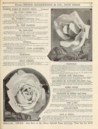 | Keywords: Everything for the garden (16389274881).jpg FrcMna PETEIR MEHDEIRSOM <br> Petals <br> MODERN ROSES OF PROVED MERIT - - Continued <br> They are all of the Hybrid Tea class except where noted <br> Mrs FOLEY HOBBS Tea <br> Ivory-white tinged pink on edges Large perfect flowers Tea-perfumed <br> thick and shell-shaped Awarded Gold Medal National Rose Society <br> Price 1st size 75c each 7 50 per doz ; 2d size 60c each 6 00 per doz ; 3d size <br> from 3-inch pots 20c each 2 00 per doz <br> Mrs HERBERT STEVENS Tea <br> A very hardy Tea Rose Color white with a distinct fawn and peach shading <br> towards center; the petals are of great depth and substance <br> Price 1st size 60c each 6 00 per doz ; 2d size SOc each 5 00 per doz ; 3d size <br> from 3-inch pots 15c each 1 50 per doz <br> Mrs MUIR MacKEAN <br> A grand bold well built flower perfect in shape and form In color it is quite dis- <br> tinct; bright carmine-crimson without shading; a splendid exhibition and garden Rose <br> Price 1st size 75c each; 3d size from 3-inch pots 30c each 3 00 per doz <br> Mrs SAM ROSS <br> An ideal garden Rose of a novel color It may be said to shade from pale straw <br> color to deep chamois-yellow with distinct flush of buff on the reverse of petals <br> Price 1st size 75c each; 3d size from 3-inch pots 25c each 2 50 per doz <br> NITA WELDON Tea <br> Ivory-white with the edges of each petal faintest blush The flowers are of large <br> size very full and of globular form the buds being long and pointed <br> Price 1st size 60c each 6 00 per doz ; 2d size 50c each 5 00 per doz ; 3d size <br> from 3-inch pots 15c each 1 50 per doz <br> OPHELIA <br> Color salmon-flesh shaded with rose; large and perfect shape; of excellent habit <br> the flowers standing up well on long stiff stems <br> Price 1st size 75c each 7 50 per doz ; 2d size 60c each <br> from 3-inch pots 35c each 3 50 per doz <br> 00 per doz ; 3d size <br> bril <br> PRINCE ENGELBERT CHAS d'ARENBERG <br> A fine erect grower with ample foliage; the bud is long and pointed Cola <br> liant fiery-scarlet An excellent garden variety and a fine forcing Rose <br> Price 1st size 75c each 7 50 per doz ; 2d size 60c each 6 00 per doz ; 3d size <br> from 3-inch pots 30c each 3 00 per doz <br> ROSEMARY <br> The flowers are large and full of a glistening silvery-pink color and borne i <br> long stems A strong growing free-flowering variety <br> Price 1st size 75c each 7 50 per doz ; 2d size 60c each 6 00 p <br> doz ; 3d size from 3-inch pots 20c each 2 00 per doz <br> RENA ROBBINS <br> A very strong grower with splendid stiff stems and large globular flowers <br> white or light lemon with orange center A fine variety for bedding <br> Price 1st size 60c each 6 00 per doz ; 2d size 50c each 5 00 per doz ; 3d size <br> from 3-inch pots 20c each 2 00 per doz <br> RADIANCE <br> RADIANCE is a seedling from CARDINAL a brilliant rosy-carmine <br> display ng beautiful rich and opaline pink tints in the open flower; the form <br> is fine largest size and full with cupped petals The bud is large brilliant ra- <br> diant; the stems are long buds and flowers borne erect on the strong stems; <br> foliage of splendid substance a dark healthy green It blooms constantly <br> delightfully fragrant and is so healthy that it may be said to be immune <br> against disease See cut <br> Price 1st size 60c each 6 00 per doz ; 2d size 40c each 4 00 per doz <br> 3d size from 3-inch pots 15c each 1 50 per doz <br> RAYON d'OK Hybrid Briar <br> Color intense orange-yellow as the bloom begins to open turning to <br> Sunflower-yellow when fully expanded; fine bronzy-green glossy foliage <br> Price strong imported plants 1 00 each 10 00 per doz <br> RECUERDO DE ANTONIO PELUFFO Tea <br> The flowers are very large borne on long straight stems with superb foliage <br> and are delightfully fragrant The color is light buff-yellow edged pink <br> Price 1st size 75c each; 2d size 60c each; 3d size from 3-inch pots 25c <br> each 2 50 per doz <br> ROBIN HOOD <br> A glorious rosy-scarlet color that is at once soft and bright and lasting; <br> the bloom is full and of the beautiful build of the Hybrid Perpetuals <br> Price 1st size 60c each 6 00 per doz ; 2d size SOc each; 3d size from <br> 3-inch pots 20c each 2 00 per doz <br> SOUVENIR DE PIERRE NOTTING <br> Strong bushy habit with splendid foliage The flowers are very full <br> large and extraordinarily lasting The buds are long of a most beautiful <br> shape The color is yellow with very delicate Chinese pink and saffron- <br> yellow shadings; the center of the flower is a very rich golden-yellow It <br> is delightfully fragrant <br> Price 1 st size 60c each 6 00 per doz ; 2d size 40c each 4 00 per doz ; <br> 3d size from 3-inch pots 15c each 1 50 per doz <br> THE LYON <br> Shrimp-pink at ends of petals center coral-red or salmon shaded with chrome- <br> yellow making amost distinct and charming combination Flowers large and <br> full; very fragrant Price strong imported plants 75c each 7 50 per doz <br> WILLOWMERE <br> Color coral-red suffused with carmine in the bud state; open flower is shrimp-pink <br> shaded yellow in the center toning to carmine-pink towards the edge of the petals <br> Price 1st size 75c each; 2d size 60c each; 3d size from 3-inch pots 25c each <br> 2 50 per doz <br> WM R SMITH <br> This magnificent variety inherits hardiness constitution fine habit grand foliage and <br> superb flowers The color is a deep ivory-white overlaid with a good bright shade of pink <br> As a summer Rose it ranks with the best See cut <br> Price 1st size 60c each 6 00 per doz ; 2d size 40c each 4 00 per doz ; 3d size from <br> 3-inch pots 15c each 1 50 per doz <br> SPECIAL OFFER One Each of the Above Splendid Roses <br> Rayon d'Or and <br> The Lyon excepted <br> Third Size for 2 50 43874929 149634 78295 Page 137 Text http //www biodiversitylibrary org/page/43874929 c1915 10 5962/bhl title 78295 Henry G Gilbert Nursery and Seed Trade Catalog Coll