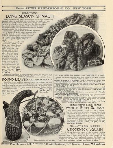 | Keywords: Everything for the garden (16389962352).jpg Ft°©m PETER HEMDEIRSOM CO D9 MEW YORE5 <br> 59 <br> HENDERSON'S <br> LONG SEASON SPINACH <br> Spinach sown in late spring and summer has a most aggravating <br> habit of going to seed just when it should be ready for use <br> Henderson's Long Season grows more slowly than others <br> but after attaining its growth will stay in that condition <br> for a much longer time so that with this variety there is <br> nothing to hinder any one from enjoying this delicious <br> vegetable during the entire season <br> This peculiar quality makes it ideal for a summer <br> crop a season in which most varieties suffer <br> severely but it is also extremely hardy <br> Sown in September and carried through <br> the winter with slight protection it <br> will give a good supply early in <br> spring <br> The plant is small with <br> lustrous green leaves <br> These are short broad <br> very thick and of so <br> great substance that <br> it loses bulk in cook- <br> ing less than any other <br> sort The leaf stems <br> are very short which <br> so greatly reduces the <br> size of the plant that <br> it forms a compact <br> dense rosette perfect <br> in color and substance <br> and unequalled in fla- <br> vor It occupies less <br> room than any other <br> sort See cut Price <br> Sc pkt 10c oz 20c ii <br> lb 50c lb <br> I have tried several kinds of Spinach for spring sowing and have come to the <br> conclusion that your Long Season' is the best Please quote me on 700 pounds <br> HARRY B SWEENEY Congress Heights D C <br> ROUND-LEAVED or dutch spinach <br> One of the oldest and best known sorts for the early spring crop <br> It may be sown at intervals during April from which very satisfac- <br> tory crops may be had quite early in the season It succeeds equal- <br> ly well as a fall crop for which purpose it is sown during the first <br> two weeks in August The Price 5c pkt <br> plants arc very com- iiftfflll M A 10c oz 15c \i <br> pact the leaves 8 – jfr lb 35c lb <br> thick and very <br> tender <br> MAMMOTH BUSH SUMMER CROOKNECK <br> WE ALSO OFFER THE FOLLOWING VARIETIES OF SPINACH <br> Varieties prefixed may be sown in the fall in latitude of New York for spring <br> crop 1 oz for 100 feet of drill <br> HARDY WINTER HENDERSON'S Slow to seed and very hardy; with <br> dark green fleshy leaves Price 5c pkt 10c oz ISc J4 lb- 40c lb <br> LONG STANDING A compact growing variety; with thick dark green <br> leaves; grows slowly but remains a long time fit for use Price 5c pkt <br> 10c oz 15c M lb 35c lb <br> NEW ZEALAND Sown outdoors after frost it soon grows to a 3 foot bush <br> and yields a continuous supply May also be sown indoors in March and <br> transplanted later Soak seed 24 hours in tepid water Price 5c pkt 10c <br> oz 30c M lb 90c lb <br> NORFOLK SAVOY-LEAVED The best for early spring or fall Price 5c <br> r kt 10c oz 15c M lb 35c lb <br> THICK-LEAVED HENDERSON'S Produces large thick crumpled leaves <br> of fine quality Price 5c pkt 10c oz 15c \i lb 40c lb <br> VICTORIA Stands in prime condition long after other varieties have bolted <br> to seed rendering it especially valuable for spring sowing and summer <br> use Price 5c pkt 10c oz 15c M lb 40c lb <br> VIROFLAY LARGE ROUND-LEAVED A large very hardy <br> variety Price 5c pkt 10c oz 15c M lb 35c lb <br> HENDERSON'S LONG ISLAND <br> White Bush Squash <br> The white scalloped Patty Pan or Cymling <br> has for years been a favorite summer Squash on <br> account of its earliness etc This sort is just as <br> early more prolific and the fruits are much deeper <br> and have less prominent scallops consequently are <br> easier prepared contain less waste arid almost twice <br> the amount of flesh The plants are of the true <br> bush habit See cut Price 10c pkt 15c oz <br> 35c M lb 1 00 lb <br> MAMMOTH BUSH SUMMER <br> Crookneck Squash <br> A highly improved type of the popular Yellow <br> Summer Crookneck The plant grows in true bush form <br> and bears just as L many fruits as the older variety but of <br> much greater size It is very heavily warted; the skin is rich <br> orange and the flesh solid deep and of superior quality See <br> Squash continued on next page cut Price 10c pkt 15c OZ 35c J4 lb 1 10 lb <br> Pou'ndefbT Peter Henderson in 1847 <br> is now carried on <br> by his son <br> Charles Henderson <br> and his <br> grandsons <br> Peter and Howard M Henderson 43874851 149634 78295 Page 59 Text http //www biodiversitylibrary org/page/43874851 c1915 10 5962/bhl title 78295 Henry G Gilbert Nursery and Seed Trade Catalog Collection ; Peter Henderson Co NameFound M lb Biodiversity Heritage Library Everything for the garden 1915 Garden Stories Books Bulbs Plants Catalogs Equipment and supplies Flowers Gardening Lawn mowers Seeds U S Department of Agriculture National Agricultural Library bhl page 43874851 dc identifier http //biodiversitylibrary org/page/43874851 bhlGardenStories BHLinbloom bulbs plants u s department of agriculture national agricultural library bhlgardenstories bhlinbloom Information field Flickr posted date ISOdate 2015-01-28 Check categories 2015 August 25 CC-BY-2 0 BioDivLibrary https //flickr com/photos/61021753 N02/16389962352 2015-08-25 02 52 20 cc-by-2 0 PD-old-70-1923 Everything for the garden 1915 Photos uploaded from Flickr by Fæ using a script |