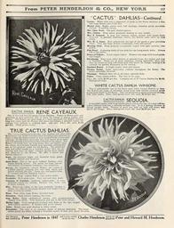 | Keywords: Everything for the garden (16390171002).jpg From PETER HENDEMOM D CO MEW YORE <br> 157 <br> CACTUS DAHL A REN£ QAYEAUX <br> One of the best free blooming Cactus Dahilias Begins to flower early and <br> continues in such profusion that at times the foliage is almost hidden with <br> flowers The flowers are quite large of a warm geranium red shaded crimson <br> long wiry stems hold the flowers well above the foliage; a splendid variety for <br> cutting very brilliant in artificial light See cut Price 50c each 5 00 <br> per doz Field grown roots <br> TRUE CACTUS DAHLIAS <br> The Cactus Dahlias have become very popular and deservedly <br> Hybridizers the world over have been devoting extra attention to <br> them so that the improvement is very marked both in form and <br> coloring In the latter particular this type shows more varia <br> tion and pleasing combinations that is found in the others The <br> flowers are borne airly on long stems they are lighter than <br> the others more loosely formed more graceful consequently <br> are of the greatest value for cut flowers The petals are <br> long and rolled usually to a rounded point; they are in- <br> curving and erect in many varieties giving great depth <br> and character to the flowers We offer a grand and <br> varied collection <br> Aegir An intensely bright red beautiful form petals <br> uniquely twisted and incurved <br> Amos Perry One of the most brilliant Dahlias; color <br> purest flaming scarlet The petals are long narrow <br> and twisted of irregular formation; very attractive <br> Aurora An exquisitely colored Dahlia; the center is <br> reddish apricot merging into soft pink which gets <br> lighter towards the tips Large size and perfect form <br> A constant and free blooming variety <br> Britannia Deep salmon flesh a very pretty shade <br> Brunhilde Rich plum color Very rich and deep shade <br> Countess of Lonsdale Lustrous salmon-pink A very <br> desirable variety for cutting Flowers very freely and <br> is nicely formed <br> Else Buttercup yellow at the base gradually shading to <br> amber the edges of the petals finished with bright Tyrian <br> rose; rivaling an orchid <br> Flora Pure white large flower beautiful form <br> Floradora Dark velvety crimson fine form <br> Oen Buller Deep cardinal-red shaded with purplish-maroon <br> Tipped with white Very attractive and one of the most unique <br> – Harbor Light Vivid orange-red overlaid with flame at the tips striped <br> with reddish carmine A distinct and novel variety <br> Juliet Bright rosy pink shading to white center <br> Kriemhilde The color is an exquisite shade of delicate shell-pink The broad <br> center petals are white forming a beautiful rosette of that color above the pink <br> CACTUS DAHUAS-Continued <br> Lawine White with just a suggestion of blush as the flower matures; a fine <br> full large flower; one of the best <br> Master Carl Bright amber with buff shadings immense petals gracefully <br> curved A sterling variety <br> Mrs Chas Scott Old gold shaded apricot <br> Mrs Clinton Deep amber gradually shading to rosy scarlet <br> Mrs F Grinsted A deep rich crimson lightly shaded with purple finely <br> incurved A L splendid exhibition variety the flowers come erect on long <br> stems <br> Mrs H J Jones Rich salmon-red the tips of the petals a pure glistening <br> white Very fine large flowers occasionally come self-colored <br> Morning Glow Deep primrose occasionally tinged with light carmine very <br> pretty <br> Pink Pearl A pleasing shade of rose pink the tips being pearly white Always <br> full to the center <br> Prince of Yellows A rich canary yellow Flowers very large with broad petals <br> tips fringed <br> Rheinkonig Pure snow white flowers of splendid form five inches and over <br> in diameter These are of great substance lasting splendidly when cut; <br> they are borne on long stiff stems held well above the foliage making it as <br> valuable for garden decoration as for cutting <br> Standard Bearer A bright scarlet clear and intense <br> Thomas Parkin Light terra-cotta uniform throughout the flower The <br> petals splendidly incurved <br> Thuringia Brilliant fiery red at all times splendid form <br> Volker Clear lemon-yellow The best in its color <br> Price 20c each 2 00 per doz Complete set of 27 Cactus Dahlias for 4 60 <br> Field-grown roots <br> WHITE CACTUS DAHLIA WINSOME <br> This is undoubtedly one of the finest pure white Cactus Dahilas to date <br> The flowers are large of beautiful cactus form with twisted incurved petals <br> giving great depth to the flower They are produced in great quantities on long <br> stiff erect stems Price field grown roots 25c each 2 50 per doz <br> CACTUS DAHLIA SEQUOIA <br> A beautiful variety with long tubular petals cleft at the tips of a deep saffron- <br> yellow suffused with red; a splendid autumn tint It is a profuse bloomer of <br> strong upright habit Flowers of good size held on long stiff stems well <br> above the foliage Price field-grown roots 40c each 4 00 per doz <br> Our Business <br> was founded by <br> Peter Henderson in 1 847 <br> and is now carried <br> on by his son <br> Charles Hend <br> -son g cSons Peter and Howard M Henderson 43874949 149634 78295 Page 157 Text http //www biodiversitylibrary org/page/43874949 c1915 10 5962/bhl title 78295 Henry G Gilbert Nursery and Seed Trade Catalog Collection ; Peter Henderson Co NameFound Aegir NameConfirmed Aegir NameBankID 4054097 NameFound Britannia NameFound Dahlia sequoia NameFound Thuringia NameConfirmed Thuringia NameBankID 4928944 Biodiversity Heritage Library Everything for the garden 1915 Garden Stories Books Bulbs Plants Catalogs Equipment and supplies Flowers Gardening Lawn mowers Seeds U S Department of Agriculture National Agricultural Library bhl page 43874949 dc identifier http //biodiversitylibrary org/page/43874949 bhlGardenStories BHLinbloom bulbs plants u s department of agriculture national agricultural library bhlgard