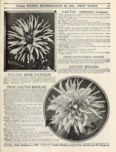 Keywords: Everything for the garden (16390171002).jpg From PETER HENDEMOM D CO MEW YORE <br> 157 <br> CACTUS DAHL A REN£ QAYEAUX <br> One of the best free blooming Cactus Dahilias Begins to flower early and <br> continues in such profusion that at times the foliage is almost hidden with <br> flowers The flowers are quite large of a warm geranium red shaded crimson <br> long wiry stems hold the flowers well above the foliage; a splendid variety for <br> cutting very brilliant in artificial light See cut Price 50c each 5 00 <br> per doz Field grown roots <br> TRUE CACTUS DAHLIAS <br> The Cactus Dahlias have become very popular and deservedly <br> Hybridizers the world over have been devoting extra attention to <br> them so that the improvement is very marked both in form and <br> coloring In the latter particular this type shows more varia <br> tion and pleasing combinations that is found in the others The <br> flowers are borne airly on long stems they are lighter than <br> the others more loosely formed more graceful consequently <br> are of the greatest value for cut flowers The petals are <br> long and rolled usually to a rounded point; they are in- <br> curving and erect in many varieties giving great depth <br> and character to the flowers We offer a grand and <br> varied collection <br> Aegir An intensely bright red beautiful form petals <br> uniquely twisted and incurved <br> Amos Perry One of the most brilliant Dahlias; color <br> purest flaming scarlet The petals are long narrow <br> and twisted of irregular formation; very attractive <br> Aurora An exquisitely colored Dahlia; the center is <br> reddish apricot merging into soft pink which gets <br> lighter towards the tips Large size and perfect form <br> A constant and free blooming variety <br> Britannia Deep salmon flesh a very pretty shade <br> Brunhilde Rich plum color Very rich and deep shade <br> Countess of Lonsdale Lustrous salmon-pink A very <br> desirable variety for cutting Flowers very freely and <br> is nicely formed <br> Else Buttercup yellow at the base gradually shading to <br> amber the edges of the petals finished with bright Tyrian <br> rose; rivaling an orchid <br> Flora Pure white large flower beautiful form <br> Floradora Dark velvety crimson fine form <br> Oen Buller Deep cardinal-red shaded with purplish-maroon <br> Tipped with white Very attractive and one of the most unique <br> – Harbor Light Vivid orange-red overlaid with flame at the tips striped <br> with reddish carmine A distinct and novel variety <br> Juliet Bright rosy pink shading to white center <br> Kriemhilde The color is an exquisite shade of delicate shell-pink The broad <br> center petals are white forming a beautiful rosette of that color above the pink <br> CACTUS DAHUAS-Continued <br> Lawine White with just a suggestion of blush as the flower matures; a fine <br> full large flower; one of the best <br> Master Carl Bright amber with buff shadings immense petals gracefully <br> curved A sterling variety <br> Mrs Chas Scott Old gold shaded apricot <br> Mrs Clinton Deep amber gradually shading to rosy scarlet <br> Mrs F Grinsted A deep rich crimson lightly shaded with purple finely <br> incurved A L splendid exhibition variety the flowers come erect on long <br> stems <br> Mrs H J Jones Rich salmon-red the tips of the petals a pure glistening <br> white Very fine large flowers occasionally come self-colored <br> Morning Glow Deep primrose occasionally tinged with light carmine very <br> pretty <br> Pink Pearl A pleasing shade of rose pink the tips being pearly white Always <br> full to the center <br> Prince of Yellows A rich canary yellow Flowers very large with broad petals <br> tips fringed <br> Rheinkonig Pure snow white flowers of splendid form five inches and over <br> in diameter These are of great substance lasting splendidly when cut; <br> they are borne on long stiff stems held well above the foliage making it as <br> valuable for garden decoration as for cutting <br> Standard Bearer A bright scarlet clear and intense <br> Thomas Parkin Light terra-cotta uniform throughout the flower The <br> petals splendidly incurved <br> Thuringia Brilliant fiery red at all times splendid form <br> Volker Clear lemon-yellow The best in its color <br> Price 20c each 2 00 per doz Complete set of 27 Cactus Dahlias for 4 60 <br> Field-grown roots <br> WHITE CACTUS DAHLIA WINSOME <br> This is undoubtedly one of the finest pure white Cactus Dahilas to date <br> The flowers are large of beautiful cactus form with twisted incurved petals <br> giving great depth to the flower They are produced in great quantities on long <br> stiff erect stems Price field grown roots 25c each 2 50 per doz <br> CACTUS DAHLIA SEQUOIA <br> A beautiful variety with long tubular petals cleft at the tips of a deep saffron- <br> yellow suffused with red; a splendid autumn tint It is a profuse bloomer of <br> strong upright habit Flowers of good size held on long stiff stems well <br> above the foliage Price field-grown roots 40c each 4 00 per doz <br> Our Business <br> was founded by <br> Peter Henderson in 1 847 <br> and is now carried <br> on by his son <br> Charles Hend <br> -son g cSons Peter and Howard M Henderson 43874949 149634 78295 Page 157 Text http //www biodiversitylibrary org/page/43874949 c1915 10 5962/bhl title 78295 Henry G Gilbert Nursery and Seed Trade Catalog Collection ; Peter Henderson Co NameFound Aegir NameConfirmed Aegir NameBankID 4054097 NameFound Britannia NameFound Dahlia sequoia NameFound Thuringia NameConfirmed Thuringia NameBankID 4928944 Biodiversity Heritage Library Everything for the garden 1915 Garden Stories Books Bulbs Plants Catalogs Equipment and supplies Flowers Gardening Lawn mowers Seeds U S Department of Agriculture National Agricultural Library bhl page 43874949 dc identifier http //biodiversitylibrary org/page/43874949 bhlGardenStories BHLinbloom bulbs plants u s department of agriculture national agricultural library bhlgarde