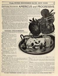 | Keywords: Everything for the garden (16390212092).jpg From FETE <br> H C <br> 179 <br> una <br> FallFruiting Strawberries AMERICUS and PROGRESSIVE <br> While they will produce fruit at the same season as the ordinary strawberries and keep on bearing until frost <br> yet to get the best results the blossoms should be kept cut off until August 1st so as to conserve the energies of the <br> plants for the fall crop Treated in that way ripe fruit will be borne in about three weeks after that date and con- <br> tinuously until frost One grower by that method gathered nearly 400 quarts from 500 plants set out in the spring; a <br> splendid demonstration of their productive power The quality is superb the size good but not up to the Jarge <br> June berries because of the season at which they are borne The plants must not be allowed to suffer for water in the <br> fruiting season and a mulch will be found to be of great advantage High cultivation is essential for the best resultsia <br> all crops and in growing these strawberries a little extra attention will pay well There is no more trouble to grow them <br> than the ordinary strawberries but they have to be attended to in proper season <br> AMERICUS The plant is medium sized with foliage a shade lighter in color than Progressive has a good heavy root <br> system and is a fairly good plant maker; strongly staminate blossoms The <br> fruit is light red heart shaped of fine texture good quality half the size of <br> Brandywine Stout fruit-stems hold the fruit well off the ground This va- <br> riety has fruited here the past four years on spring set plants and new runners <br> from July to cold weather It is not uncommon for a spring set plant to <br> produce from six to twelve well-loaded fruit-stalks Price 10c each <br> 1 00 per doz 8 00 per 100 <br> PROGRESSIVE A splendid grower healthy and hardy very produc- <br> tive The plant is of medium size the blossom strongly staminate <br> and very resistant to heat Both blossoms and fruit are well protected <br> by the strong healthy foliage The fruit is rich and sweet; a deep red <br> inside and out; of good medium size with a slight neck and quite firm <br> Plants set in August and September fruit the next spring and on the new <br> runners from July until frost Spring set plants fruit the same year they <br> ˘re set out Price 10c each 1 00 per doz 8 00 per 100 <br> NEWER STRAWBERRIES <br> The strawberries following were transplanted into cold frames in the fall and <br> It planted out any time before May 5th will under proper conditions fruit <br> some the present year <br> All the varieties offered are perfect flower- <br> ing bisexual except where marked P or <br> pistillate The latter must have a row of a <br> perfect flowering sort every nine or twelve <br> feet to pollenize their blossoms <br> ABINGTON Midseason A grand <br> berry a strong grower and great plant maker <br> Grows 10 to 12 inches high with heavy fruit <br> – talks which stand erect The berries are of <br> large size a fair average is 25 to a quart <br> They are bright red firm and of good flavor <br> CARDINAL P Midseason The <br> berries are large and beautiful perfectly <br> delicious The plant is ideal strong and <br> vigorous It is a pistillate variety Named <br> because of its brilliant color <br> CHIPMAN Second early Round ber- <br> ries uniform large beautiful color and <br> splendid quality A vigorous healthy grower <br> Fruit firm and an excellent keeper <br> COMMONWEALTH Very late The <br> berries are of the largest ; and broadly cone- <br> shaped and quite smooth; moreover it is <br> very late <br> CORSICAN Midseason A distinct var- <br> iety The fruit is dark crimson rich and <br> delicious flavor large size and firm <br> EARLY OZARK Extra early It is a cross between the popular var- <br> ieties Aroma and Excelsior The berries are almost round and bright red in <br> color The plant is a grand grower with healthy large dark green leathery <br> foliage and exceedingly prolific See cut page 180 <br> FENDALL P Midseason to late A magnificent variety berries rich <br> red smooth and glossy Largest size and superb flavor Growth vigorous <br> very deep rooting season of fruiting very long A very valuable introduction <br> FREMONT WILLIAMS Late A valuable late variety The plants are <br> healthy of medium size compact not subject to rust or mildew and very pro- <br> lific The berries are large and uniform conical in shape and very firm The <br> surface color is a dark glossy crimson and that of the flesh light red The <br> flesh is of fine texture and the flavor all that could be desired The calyx <br> is large and separates readily from the fruit making it easy to hull <br> HERITAGE Midseason to late The plant is very large of extremely <br> heavy texture It is very deep rooting ” drought and disease resisting and <br> a prodigious yielder ” from mid-season until very late of unusually large and <br> beautiful berries of a dark shining crimson color and round-tapering conical <br> shape The flesh is solid of fine texture and Its delicious flavor is unsur- <br> passed <br> MASCOT Late A new late sort of unusually large size and productive- <br> ness Season same as Gandy lasting longer and usually producing a better <br> crop of equally good berries It has been found to do well on land too dry for <br> Gandy <br> NORWOOD Medium early to mid-season A Massachusetts production <br> said to be a cross between Marshall and Corsican The plant is large and vig- <br> orous bearing for a long season enormously large berries generally rounded <br> conical in form though sometimes flattened The color is bright rich red from <br> surface to center and the quality excellent See cut page 180 <br> RELIANCE Midseason This is a perfect flowered variety ripens with <br> the Marshall and has a long season It is remarkably uniform in shape for <br> such a large berry The quality is unsurpassed juicy luscious solid to the center <br> the
