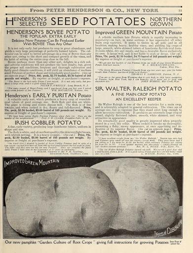 | Keywords: Everything for the garden (16390874245).jpg From PETER MEMDEIRSOM <br> CO 09 MEW YOU <br> 55 <br> H en s d e e l1 seed potatoes <br> NORTHERN <br> GROWN <br> HENDERSON'S BOVEE POTATO <br> THE POPULAR EXTRA EARLY <br> Delicious New Potatoes Can Be Produced Earlier <br> With BOVEE Than Any Other <br> It is not only early but produces its crop in great abundance and <br> yields a very large percentage of perfectly formed tubers The cul- <br> tivator can be used to better advantage on a crop of Bovee than any <br> other sort owing to the short and compact growth of the vines and <br> its habit of setting the entire crop close in the hill <br> Bovee perhaps more than any other sort delights in a rich soil <br> and adverse conditions will not produce the best results; but given <br> the proper soil conditions frequent and thorough cultivation and <br> fairly good climatic conditions it will yield an abundance of medium <br> sized Potatoes of perfect shape and remarkably good quality See cut <br> on opposite page Price 80c peck 2 75 bushel 5 50 barrel of 165 <br> pounds net weight By express or freight at purchaser's expense <br> The Bovee is the best early Potato I ever raised It is not only early but pro- <br> duces a large crop and is a good winter keeper <br> PETER F O'REILLY Long Branch N J <br> For every pound of Bovee Potato seed I purchased from you last year I raised <br> sixty-seven pounds of fine Potatoes WM BOUGHTON Norlons Ore <br> Henderson's EARLY PURITAN Potato <br> A valuable early sort which produces a heavy crop of roundish- <br> oval tubers of good average size Both flesh and skin are white <br> The plant is strong and resists disease well The flesh is of fine <br> texture and when cooked is dry floury and full-flavored Price <br> 75c peck 2 50 bushel 5 00 barrel of 165 pounds net weight By <br> express or freight at purchaser's expense <br> We have been eating Early Puritan Potatoes since July 1st They are the <br> wonder of the neighborhood Prof J H CLARK Franklin Falls N H <br> IKISH COBBLER POTATO <br> A fine early variety producing large handsome tubers uniform in <br> shape and size <br> The flesh is white and of excellent quality; the skin verylight brown <br> with whitish netting It is a heavy cropper See cut Price 75c <br> peck 2 50 bushel 5 00 barrel of 165 pounds net weight By <br> express or freight at purchaser's expense <br> On April 21st I planted J bushel of Irish Cobbler Potatoes and in spite of a <br> late season we had frost here on June 9th we had good Potatoes the last week in June <br> The folks said they were too big for new Potatoes They are certainly the finest <br> early Potato I have seen in my experience of 37 years in gardening <br> S RIKER Gardener to Mr F H Spaldings <br> Ellensbrook Farm Southbury Conn <br> Improved GREEN MOUNTAIN Potato <br> A reliable medium late Potato which is rapidly increasing in <br> popularity ” in fact in some sections it has superseded all other <br> main crop varieties It seems to thrive in all soils and in all <br> localities making heavy healthy vines and yielding big crops of <br> large smooth white skinned tubers of handsome flattish oval form <br> It cooks white dry and mealy and has a desirable flavor exclusively <br> its own It keeps well and is not liable to scab or decay See cut <br> Price 75c peck 2 50 bushel 4 75 barrel of 165 pounds net weight <br> By express or freight at purchaser's expense <br> We got over five bushels of fine Potatoes from one peck of your Green Mountain <br> Potato Seed last season W J MICKLETHWAITE <br> Yukon West Fla <br> The Green Mountain Potatoes I bought from you two years ago gave far belter <br> results than Potatoes purchased from local dealers <br> THOMAS F GARRISON Fairton N J <br> You are so far away from Wyoming that it costs high to ship large quantities <br> of Potatoes from New York but I can honestly say I never got as good seed <br> anywhere else JOHN HORRIE Hat Creek Wyo <br> SIK WALTEK RALEIGH POTATO <br> A FINE MAIN CROP POTATO <br> AN EXCELLENT KEEPER <br> Sir Walter Raleigh is one of the best varieties for a main crop <br> and is admirably adapted to general cultivation The vines are of <br> average size but so vigorous that they stand erect long enough to <br> allow necessary cultivation It produces an extremely large crop of <br> round slightly flattened tubers smooth white skinned and very <br> attractive in appearance <br> Its remarkably good quality is greatly improved when properly <br> stored in a cool dry cellar When cooked it breaks up thoroughly <br> presenting a flaky snowy appearance at once appetizing and in- <br> dicative of its superior flavor See cut on opposite page Price <br> 75c peck 2 50 bushel 5 00 barrel of 165 pounds net weight <br> By express or freight at purchaser's expense <br> I have excellent results from my 'Sir Waller Raleigh ' Season was very bad <br> and Potatoes grew small all over the country except mine They grew large and I <br> am selling as I dig them for 1 00 per bushel while ordinary Potatoes are selling <br> for from 55c to 70c I used neither manure nor phosphate ” simply planted on <br> sod ” broken autumn previous Rev W L RILEY D D Kane Pa <br> The Sir Walter Raleigh Potatoes turned out well We raised a good four and <br> a half bushels from a peck It is a good eating Potato and there are not many small <br> ones in a hill L MAYER Roxbury Sta Conn <br> Our new pamphlet Garden Culture of Root Crops giving full instructions for growing Potatoes s edlo 43874847 149634 78295 Page 55 Text http //www biodiversitylibrary org/page/43874847 c1915 10 5962/bhl title 78295 Henry G Gilbert Nursery and Seed Trade Catalog Collection ; Peter Henderson Co Biodiversity Heritage Library Everything for the garden 1915 Garden Stories Books Bulbs Plants Catalogs Equipment and supplies Flowers Gardening Lawn mowers Seeds U S Department of Agriculture National Agricultural Library bhl page 43874847 dc identifier http //bio