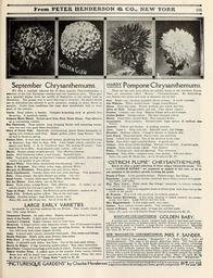 Keywords: Everything for the garden (16391086135).jpg September Chrysanthemums <br> We offer a carefully selected list of these popular Chrysanthemums a <br> – election of the best European varieties and two American sorts These give <br> us a splendid display from the middle of September to the second week in <br> November The proper way to grow this type is outdoors; the plants should <br> not be disbudded but allowed to grow naturally making as many shoots as <br> possible Under these conditions this type does wonderfully well in most <br> parts of the country <br> Carrie Deep yellow; a beauty Compact branching style of growth free <br> flowering A standard variety <br> Crimson Marie Masse Bronze sport from Mme Marie Masse Very effective <br> as a contrasting variety <br> Fee Parisienne Deep mauve; long drooping florets with incurving center; <br> very free and very good when disbudded <br> Glory of Seven Oaks Practically everblooming plants flower frequently in <br> spring and continue until frost Bright golden yellow large flowers May <br> be had in bloom in spring <br> Golden Glow A very early incurved variety producing fine blooms 5 J inches <br> in diameter Aug 20th to Sept 10th Color bright yellow splendid sub- <br> stance and finish C S A Certificate Sept 7th scoring 90 points Take <br> bud July 1st to 20th An invaluable early variety See cut <br> Harrie Bronzy orange on gold ground Very effective coloring <br> Leslie Rich buttercup yellow a real beauty Splendid habit <br> Lillie Pearl pink as large as Goacher's Crimson splendid habit An excellent <br> variety for garden or pot culture <br> Market White Pure white wonderfully free blooming See cut <br> Mme F Bergman Pure white a fine large globular flower <br> Marquis de Montmort Pure glossy rose and silvery white <br> Perle Chatillonaise Creamy white with rosy pink shadings Very attractive_ <br> Polly Deep orange; the early flowers are amber See cut <br> Ralph Curtis Creamy white sport from Mme Marie Masse <br> Roi des Blancs Pure white; one of the best <br> Rosie Terracotta; a large flower Very effective color It makes an ex- <br> cellent variety for cutting in sprays See cut <br> Tapis de Neige Pure white; flat flowers in great profusion; earliest of all <br> Tapis d'Or Brilliant golden yellow One of the very best <br> Tonkin Reddish orange; large flowers; lovely color <br> Price 20c each 2 00 per doz Set of 19 for 3 00 <br> LARGE EARLY VARIETIES <br> Invaluable for growing outdoors for cut flowers They usually bloom by <br> Oct 15th large flowers <br> Clementine Tousset An early white Slightly tinted pink from late buds <br> Glory of the Pacific A light pink broad petals <br> Goacher's Crimson Bright crimson best in bush form <br> Monrovia A bright yellow early Japanese variety One of the easiest to grow <br> October Frost Good early white; large spreading flowers In bloom about <br> Oct 10th from buds taken August 10-12th <br> Opah A grand early variety beautiful blush-pink Fine stems and foliage <br> Pacific Supreme Bright pink large flowers long stems <br> Polly Rose A very fine and large early white <br> Pride A splendid early white; fine form One of the best early whites <br> Reveil de Beiges A big incurving golden-yellow Fine when disbudded <br> Roi d'ltalie Compact incurving; a rich shade of yellow Perfect stem and foliage <br> Yellow October Frost A yellow sport of the popular white variety October <br> Frost that will be found very valuable for early cutting Price 15c each <br> 1 50 per doz ; set of 12 Large Early sorts for 1 50 <br> hardy Pompone Chrysanthemums <br> These are the only sorts which are reliably hardy in the Northern States- <br> They are sometimes called Button Chrysanthemums By disbudding <br> nice flowers two inches and more in diameter can be had <br> Acto Bright rose showing beautiful silvery reverse A lovely contrast <br> Ada Williams White shaded blush Large round flowers <br> Aileen Deep lilac-pink Flower medium size round and full <br> Arbre de Noel Orange-yellow and red Very showy variety <br> Dundee Crimson very deep Elegant foliage and a good keeper <br> Golden Bedder Golden-yellow The best standard yellow <br> Hester Pearl-white shaded flesh Fine rounded flower <br> Jacquenette Rosy-carmine Exceptionally large sprays of medium ilea <br> flowers <br> Jeanette Yellow and bronze A striking contrast <br> Jules Lagreve Deep rich red Splendid habit fine foliage <br> Klondike Brilliant yellow Compact blooms of medium size <br> Lady Duvol Deep rosy-pink; fine in color size and form <br> Leroy Yellow and bronze One of the showiest in its color <br> Nydia Pure white high rounded flower A grand sort <br> Ontario Pink silvery-white shadings Flowers very double A perfect gem <br> Quinola Deep clear orange yellow Very distinct <br> Rufus Venetian red; deep and glowing Very attractive <br> Snowdrop Pure white; compact form very profuse The best white <br> Price 15c each 1 50 per doz ; set of 18 sorts for 2 25 <br> OSTRICH PLUME CHRYSANTHEMUMS <br> Below we offer a grand collection of those unique Chrysanthemums The <br> term OSTRICH PLUME we originated as applied to this type so as to <br> call attention to the feathery growth covering the petals <br> Beauty of Truro A rich purplish-bronze Flowers large; fine foliage <br> Eiderdown Large perfectly double incurved snow-white covered with gland- <br> ular hairs stiff stems <br> Hon Thos Lowry Habit short fine foliage; incurved; a curious mixture <br> of yellow red and rose <br> Louis Boehmer This is an exquisite shade of silvery-pink with deep rose on the <br> inside of the petals <br> M Fromont Fine dark red incurved beautifully plumed <br> Miss Louise Hartshorne A fine pink shading to yellow towards the center; <br> petals very hairy Large flowers and fine form <br> Mrs Higginbotham A rich bright pink very hairy <br> Ondine Rosy salmon reverse amber Very attractive <br> Queen of Plumes A bright pink; of large size and fine build <br> Price 15c each 