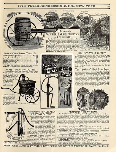 | Keywords: Everything for the garden (16391161715).jpg The Barrel is raised from the ground carried to <br> the place desired and can be readily disconnected <br> from or attached to the truck while barrel is either <br> full or empty We supply as extra attachments <br> the following A Box with trunnions and spring <br> catch making a very superior dumping Hand-cart <br> A Sprinkler invaluable for watering lawns and <br> sprinkling walks water is turned on and off by <br> hand wheel and ball valve ; A Leaf Rack very <br> useful for removing leaves and litter; A Gem <br> Force Pump for spraying etc <br> Prices of Water Barrels Trucks Etc <br> Truck and barrel 1 J in tire 12 00 <br> « 2 13 00 <br> « – 3J 14 00 <br> Extra barrel new with trunnions on 3 25 <br> Extra trunnions per pair 0 50 <br> Hand-cart Box Extra 3 00 <br> Leaf Rack 5 00 <br> Sprinkler attachment 3 25 <br> // truck and trunnions without barrel are wanted <br> ieduct 2 75 from prices of trucks with barrel <br> ACME SRPAYING OUTFIT <br> A convenient outfit for spraying garden crop <br> flowers shrubs vineyards etc The tank holds <br> about 25 gallons is <br> firmly fastened to a <br> cart narrow enough for <br> most garden paths <br> The force-pump has <br> brass cylinder <br> to prevent cor- <br> rosion when <br> fungicides are <br> ised See cut <br> Price complete <br> cart pump 6 ft <br> discharge hose and <br> combination spray <br> and stream nozzle <br> 15 00 Iron ex- <br> tension pipe 8 feet <br> ¢for tree spraying fitted to attach to nozzle and hose <br> SI 50 extra <br> GEM SPKAYING OUTFIT <br> Clamps to the barrel; fills the want for a low- <br> priced pump for spiaying a few trees bushes vines <br> etc and for watering flower-beds washing windows <br> carriages etc Prices without barrel or truck ; <br> Gem Outfit A Pump fitted with two feet of <br> suction pipe and brass strainer 5J feet i-inch hose <br> and nozzle 6 00 <br> Gem Outfit B same as A excepting hose <br> is 12£ ft long fitted with connection for pole to <br> spray 7 00 <br> The Henderson Hand Bucket Pump <br> This is the best and most durable portable hand <br> pump in the market Working parts are made ef <br> solid brass with large air-chamber and is double act- <br> ing throwing an absolutely continuous stream either <br> solid or in a fine spray as desired Very light and <br> easily carried and works from any bucket or tub <br> Just the thing for throwing liquid insecticides and <br> fungicides on low trees shrubs plants etc and by <br> altering the nozzle it can be used for washing car- <br> riages windows etc See cut Price with 3 feet <br> of hose and combination spray and stream nozzle <br> 3 75; or with extra 7 feet section of hose and pole <br> connection for tree spraying 4 75 <br> HENDERSON'S FPvUITALL <br> SPRAYING OUTFIT <br> A simple high-grade up-to-date pump <br> embodying several important im- <br> provements All working parts of <br> brass It can be mounted on or re- <br> moved from barrel by two thumb- <br> screws Air-chamber of un- <br> usually large capacity A <br> long adjustable handle It is <br> low down and within the <br> barrel offering no obstruction <br> to limbs and is not top-heavy The <br> pump is large but easily operated by a <br> single person The agitator is mechan- <br> ical in action A most efficient and <br> satisfactory spray pump See cut <br> Henderson Outfit A Pump with <br> one lead 10 feet J-inch discharge hose <br> with Vermorel Spray Nozzle and <br> Agitator 10 00; with barrel 13 00 <br> Our Implement Catalogue mailed free on application illustrates and de- <br> nbes a full line of Hand and Horse Power Spravinc Instruments <br> ¢cribes <br> POMONA SPRAY PUMP <br> We offer this as the best Orchard Spray Pump for mounting on barrel <br> It is of large capacity and powerful with long adjustable leverage so that it <br> is easily operated by one person when necessary but is especially built for <br> spraying from two leads of hose The unusually large steel air chamber gives <br> sufficient pressure for a continuous and regular spray All working parts are of <br> brass including plunger and valves which are easily accessible; it has a paddle <br> agitator It is adjustable for barrels of different sizes and as the bulk of the <br> Pump goes within the barrel it is not top-heavy and does not catch low branches <br> We furnish the Pomona for end of barrel only <br> PRICES <br> Pomona Pump with Agitator 15 00; or fitted to barrel 18 00 <br> Pomona Outfit A Pump agitator 1 lead discharge hose 15 feet and <br> spray nozzle 18 00; or fitted to barrel 21 00 <br> Pomona Outfit B Pump agitator 2 leads discharge hose 15 feet each <br> and 2 mistry spray nozzles 20 00; or fitted to barrel 23 00 <br> EXTRAS FOR TALL TREE SPRAYING <br> The following are adaptable for any of our Spray Pumps <br> Iron Extension Rods 8 feet long with shut-off cock at base fitted to attach <br> hose at bottom and nozzle at top 1 50 each <br> Extra Spray Nozzles Mail weight 1 lb each <br> BORDEAUX for 1 in pipe 75c ; for h in hose 90c <br> VERMOREL Single spray 75c; Double spray 1 50; Triple spray 2 00 <br> Brass shut-off for 1 lead 1 00 extra; for 2 leads 1 35 extra <br> Spray Hose inch 10c per foot Couplings extra 25c per set <br> ON ARTICLES WANTED BY PARCEL POST EXTRA FOR POSTAGE MUST BE ALLOWED See Page I 43874987 149634 78295 Page 195 Text http //www biodiversitylibrary org/page/43874987 c1915 10 5962/bhl title 78295 Henry G Gilbert Nursery and Seed Trade Catalog Collection ; Peter Henderson Co NameFound Pomona Biodiversity Heritage Library Everything for the garden 1915 Garden Stories Books Bulbs Plants Catalogs Equipment and supplies Flowers Gardening Lawn mowers Seeds U S Department of Agriculture National Agricultural Library bhl page 43874987 dc identifier http //biodiversitylibrary org/page/43874987 bhlGardenStories BHLinbloom bulbs plants u s department of agriculture national agricultural library bhlgardenstories bhlinbloom I