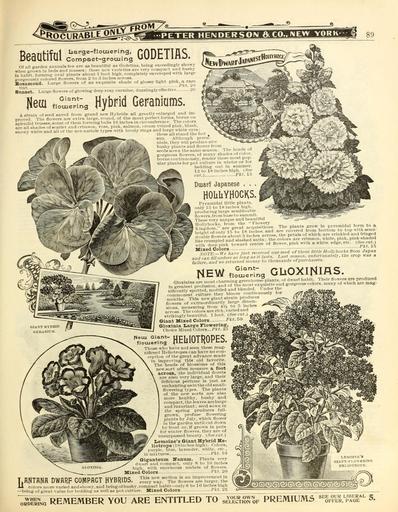 | Keywords: Everything for the garden (16828292486).jpg ˘PETER HENDERSO N fl; CO IMEW YORK <br> 89 <br> Beaatifal crirctTo' Tn g GODETIAS <br> Of all earden annuals few are as beautiful as Godetias being exceedingly showy <br> when grown in beds and masses; these new varieties are very compact and bushy <br> In habit forming oval plants about 1 foot high completely enveloped with large <br> Eorsreouslv colored flowers from 2 to 3 inches across <br> Rosamond Large flowers of an exquisite shade of glossy light plnk a mre <br> Sunset Large iaowers of glowing deep rosy carmine dazzlingly effective 20 <br> Ilem <br> Giant- <br> flotuering <br> Hybrid GeFaniams <br> A strain of seed saved from grand new Hybrids all greatly enlarged and im- <br> DFOved The flowers are extra large round of the most perie t forms borne on <br> splendid trusses some of them forming balls 16 inches in circumference The i rs <br> are all shades of scarlet and crimson rose pink salmon cream veined pink blush <br> snowv white and all of the new auricle types with lovely rings and large white eyes <br> these all stand the M <br> sun Although perm <br> nials they will produce i <br> bushy plants and flower <br> seeds sown the same si i <br> gorgeous flowers of mo <br> borne continuousU ren <br> ular plants for pot cultuic in wintei or toi <br> bidding out in summer <br> 1 J to 18 ini lies hi ;h s <br> cnt /'A' 1 <br> Doiarf Japanese <br> HOIiliYHOCKS <br> Pyramidal little plants <br> only 15 to 18 inches high <br> jiroducing large semidouble <br> llowers frombaseto summit <br> These very unique and beautiful <br> Hollyhocks from the Flowery <br> kini vdom are great acquisitions The plants grf <br> Kingdom are fercrt ' covered from bottom to top with semi <br> row in pyramidal form to a <br> i'oTI -We h ve'jusrrec of these mtle Hollyhocks from Japan <br> NEW «°iT rn3 Giioxmifls <br> ost charming greenhouse plants of dwarf habit Their flowers are produced <br> ton and of thi most exquisite and gorgeous colors many of which are mag- <br> ' e <br> GIANT B\BRID <br> GERANIUM <br> Gloxinias are m <br> i fi nHrspStted mottl 5 and'blended Un ier the <br> commonest culture they bloom continuously for <br> months This new giant strain produces <br> flowers of extraordinarily large_ dimen- <br> sions measuring from 4V2 to o inches <br> across The colors are rich varied and <br> strikingly beautiful 1 foot See cut <br> Giant lAixed Colors P - <br> Gloxinia Largre Flowering <br> Choice Mixed Colors /'At 2 <br> oiant- jiEiiioTt OPES <br> flotueping <br> Those who have not seen these mag- <br> Diflcent Heliotropes can have no con- <br> ception of the great advance made <br> in improving this old favorite <br> The heads of blossoms of this <br> new sort often measure a foot <br> across the individual ilorets <br> are also very large and their <br> delicious perfume is just as <br> enchanting as in the old small- <br> flowering types The plants <br> of the new sorts are also <br> more healthy bushy and <br> compact the leaves arelarge <br> and luxuriant; seed sown in <br> the spring produces full- <br> grown profuse flowering <br> plants by Inly which flower <br> in the garden until cut down <br> by frost or if grown in pots <br> for winter flowers they are of <br> unsurpassed beauty See cat <br> Iiemoine's Giant Hytorid He- <br> liotrope 18 inches high Colors <br> jiuiple blue lavender white etc <br> mixtures Pkt 10 <br> Giffantenm Nantim Plants very <br> dwarf and compact only 8 to 10 inches <br> high with enormous umbels of flowers <br> Mixed Colors Pkt 20 <br> T flNTflNfl DWRHF GOlflPflGT HYBHIDS e J w y Tt Jre rs r JIr ti e <br> U colors more varied andshowy and Ijeingof bushy compact habit ” only 8 to 1 inches higli <br> ”being of great value for bedding as well as pot cultui-e Mixed Colors t kt _o <br> rTe q remember you are entitled to sE E cUroF PREMIUMS BpSTa I 5 42383178 133997 66553 Page 89 Text http //www biodiversitylibrary org/page/42383178 1902 10 5962/bhl title 66553 Henry G Gilbert Nursery and Seed Trade Catalog Collection ; Peter Henderson Co NameFound Gloxinia NameConfirmed Gloxinia L'Her EOLID 72184 Biodiversity Heritage Library Everything for the garden 1901 Garden Stories Catalogs Flowers Peter Henderson Co Plants Ornamental Seed industry and trade Seeds Trade catalogs U S Department of Agriculture National Agricultural Library bhl page 42383178 dc identifier http //biodiversitylibrary org/page/42383178 bhlGardenStories Hollyhocks Geraniums Gloxinia Heliotropes BHLinbloom peter henderson co plants ornamental u s department of agriculture national agricultural library bhlgardenstories bhlinbloom Information field Flickr posted date ISOdate 2015-03-18 Check categories 2015 August 24 CC-BY-2 0 BioDivLibrary https //flickr com/photos/61021753 N02/16828292486 2015-08-24 20 54 15 cc-by-2 0 PD-old-70-1923 Gloxinia Everything for the garden 1902 Photos uploaded from Flickr by Fæ using a script |