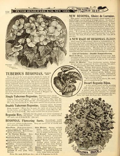 Keywords: Everything for the garden (16828396476).jpg ePECIMEN <br> PLANT <br> TDBEBOU8 <br> BEUONIA <br> selected <br> TUBEROUS BEGONIAS Vs <br> These are now the most popular plants for beds of <br> summer flowers or as pot plants for the greenhouse <br> conservatory or sitting room Our bulbs are all sound <br> – well matured and of good size For a time it was gen- <br> erally supposed these could not be grown in the open <br> air with success but extensive plantings of them in <br> various sections of the country have demonstrated their <br> adaptability for this purpose Nothing can exceed the <br> brilliancy and richness of their flowers From the time <br> the first blossom appears until all growth is topped by <br> frost they are never out of bloom See cut <br> Single Tuberous Begonias Ifr 'fiAt cl' uso <br> White Pink and Salmon Price dry bulbs up to May 15th 10c <br> each set of 6 for 50c S6 00 per 100 Growing plants ready May 1st <br> 20c each set of 6 for SI 00 Dry bulbs mailed free at prices quoted <br> Separate colors Scablet <br> Cbimson White Yellow <br> Pink Salmon Price free by mail 30c each set of 4 sorts 1 00 <br> for dry bulbs up to May 15th Growing plants ready May 1st 40c <br> each set of 4 for SI 50 Dry bulbs mailed free at prices quoted <br> p _ Y Valuable for the grand and varied markings of <br> IVCA the leaves A fine collection of named sorts <br> NEW BEGONIA Gloire de Lorraine <br> This grand variety makes graceful plants about 1 foot <br> high foliage regular and of a bright green ; the plant is <br> loaded with rose-colored flowers of great beauty remain- <br> ing for many weeks without falling and borne in large <br> drooping panicles It flowers from October to May in a <br> shaded greenhouse or sitting-room window The French <br> English American and German horticultural papers have <br> been unanimous in their praise of this magnificent va- <br> riety It is grown by the thousand for the Paris and <br> London markets and will be equally popular here Price <br> 1st size 75c each 7 50 per doz ; 2d size 50c each 4 50 <br> per doz <br> A NEW RACE OF BEGONIAS i S j <br> After years of painstaking efforts in hybridization M <br> Lemoine of France succeeded in producing varieties of <br> this beautiful and useful Begonia having double flow 'rft <br> beautifully crested fully as free in bloom as the single <br> form and as easily grown Whether for the garden in <br> summer the greenhouse or conservatory in winter the <br> beautiful and rare varieties will be found equally \ aluable <br> List of Varieties ” Double Semperflorens <br> Boule de Neige Leaves clear green flowers large full <br> arranged in tiers at the summit of the stalk pure white <br> bordering sometimes lightly on pink in the open air <br> stamens clear yellow <br> Gloire du Montet Very floriferous variety foliage <br> bronzj' green ; numerous flowers covering the plant <br> flowers double lake rose carmine reverse <br> Nimcy Foliage deep green flowers medium <br> double tender rose stamens chrome yellow <br> Triumph de Lorraine Foliage bronzy <br> green or chestnut green flowers very <br> numerous double petals imbricated <br> color carmine cerise stamens gold bud <br> on the reverse scarlet <br> Price for any of the above 50c each <br> set of 4 sorts for SI 50 <br> Dwarf Begonia Bijou <br> A very pretty dwarf variety growing <br> only about 9 inches high and covered <br> with intense scarlet crimson flowers <br> A perfect gem for pot culture blooming <br> continuously equally valuable for outside <br> planting in masses or as a border plant See cut <br> Price 15c each 1 50 per doz 8 00 per 100 <br> Double Tuberous Begonias <br> Beg <br> onia <br> 15c each set of 12 for 1 50 <br> See cut <br> BEGONIAS Flowering Sorts JSlSegarS <br> or for pot culture in the house <br> have graceful waxy flowers <br> Alba Picta Dark green leaves <br> lance-shaped silvery spots <br> Argentea Guttata Rich bronzy <br> green silver-spotted <br> B de Chateau Rocher Rich <br> waxy red very free blooming <br> Manicata Aurea Green foliage <br> irregularly marked yellow 20c <br> Margaritae Bronze and dark green <br> leaves rich salmon pink flowers <br> MetaUica Crimson and maroon <br> foliage pink and white flowers <br> Kitida Large smooth Ele- <br> phant's Ear leaves Grand <br> panicles of rosy pink waxy <br> flowers <br> Price 10c each 1 00 per doz <br> They are never out of bloom and - <br> Otto Hacker Strong upright <br> habit large shining green <br> leaves immense pendant clus- <br> ters of bright red flowers 15c <br> Paul Bruant Large panicles of <br> light rose flowers Leaves fan- <br> cifully crinkled and scalloped <br> bronzy green with red stems <br> Purity Dwarf compact habit <br> shining green leaves and a <br> wealth of waxy white flowers <br> both summer and winter 15c <br> Rubra Dark coral color <br> Saunderaonii Bright waxy red <br> Vernou A splendid Bedding va- <br> riety waxy white and pink <br> ; set of 13 Begonias for 1 25 42383239 133997 66553 Page 150 Text http //www biodiversitylibrary org/page/42383239 1902 10 5962/bhl title 66553 Henry G Gilbert Nursery and Seed Trade Catalog Collection ; Peter Henderson Co NameFound Begonia NameConfirmed Begonia aff palmata GBG 002-089-95 EOLID 11904651 NameFound Lemoine NameConfirmed Lemoine NameBankID 4964481 NameFound Manicata NameFound Picta NameConfirmed Picta NameBankID 5100567 Biodiversity Heritage Library Everything for the garden 1901 Garden Stories Catalogs Flowers Peter Henderson Co Plants Ornamental Seed industry and trade Seeds Trade catalogs U S Department of Agriculture National Agricultural Library bhl page 42383239 dc identifier http //biodiversitylibrary org/page/42383239 bhlGardenStories Begonia BHLinbloom peter henderson co plants ornamental u s department of agriculture national agricultural library bhlgardenstories bhlinbloom Information field Flickr posted date ISOdate 2015-03-18 Check categories 2015 August 24 CC-BY-2 0 BioDivLibrary http