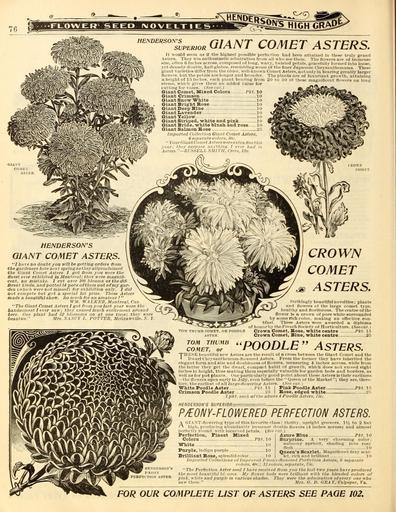 Keywords: Everything for the garden (16854133015).jpg že „¢Â«so s qjj j comet asters <br> It -would seem as if the highest possible perfeition had been attained in these truly grand <br> Asters They win enthusiastic admiration fnmi all who see them The liowers are ol immense <br> size often 6 inches across composed of long wavy twisted petals gracefully formed into loose <br> yet densely douhle halt-globes resembling some of the finer Japanese Chrysjuithemums These <br> 'ill\ UWf giant varieties differ from the older well-known Comet Asters notouly in bearing greatly larger <br> iMaW lowers but the petals are longer and broader The plants are of luxuriant growth attaining <br> aliiijihtofl T inches each plant bearing from 20 to 30 of these magnilicent flowers ou long <br> Ktinis wliich gives them an added value for <br> cutting for vases iSpeciil <br> ifn Giant Comet Blized Colors Pkt 10 <br> il w» Giant Crimson 10 <br> 1 K\Vm© Giant Snow White 10 JSaitira g\ <br> 'i vjEE'tM Giant Bright Bose 10 fiOBBvv ' <br> Giant Deep Bine 10 3BSS r <br> Giant Lavender 10 B m -' <br> Giant Yellow lo B fflgkfer <br> Giant Striped -white and pink 10 ~ <br> r/rir«i Mlf Giant Bride white blush and rose 10 SM j sS - j ' ' Zy S JiP <br> V- » Giant Salmon Hose 2 'jBPS E 'g ' l k <br> jf S i Imported Cullfriion Giant Comet Asters <br> 7iK 3 sepunite colors ij /c <br> y jVi'5V J' N YourGmntCometAsterswereextratlnethis BT HITVilf f 'V lll 'Ki illi1lT' l <br> Ti'mrri'-' \vX rc/jr; f/iei' s«r/j i s s aiiytliiiin I ever lind in <br> i'M'lMylM Asters ” RLSHELL SMITH Crrtr Ills tLromn i L~Mlim ITil IT ¢ T-ll <br> HENDERSON'S <br> GIANT COMET ASTERS <br> I bn ve no doubt yon vill be getting orders fi-om <br> the gardeners lure next spring nstbeyallproclaiined <br> tbe Giant Comet Asters I got O-om you were the <br> Snest ever exhibited in Montreal they Mere niagnitl- <br> – cent no mistake I cut over 100 blooms at the dif- <br> ferent kinds and potted 14 pots otthem out of my gar- <br> – den nliifh were not missed for exbiliition only I did <br> not compete but got a special 1st prize These Asters <br> made a beautifiil show So much for au amateur I <br> ir l/ WALKKIt Montreal Can <br> The Giant Comet A sters I got from you last year were the <br> tandsomest I ever saw; they caused much excitement around <br> here One plant bad 52 blo ssonis on at one time; tbe y were <br> beauties Mrs \A\CY L POTTER McGrawville N Y <br> CROWN <br> COMET <br> ASTERS <br> TOM THfMB rOMET OR POODLE <br> ASTEIl <br> Strikingly beautiful novelties; plants <br> and liowers of the large comet tyi e <br> healthy and floriferous The centre of the <br> flower is a crown of pure white surrounded <br> by some rich color making an effective con- <br> trast These Asters were awarded a diploma <br> of lionorliy the French Sricli-ty of Horticulture Seecut <br> Crown Comet Bose -white centre Pkt 15 <br> Cro-wn Comet Bine white centre 25 <br> TOM THUMB <br> COMET or <br> POODLE Asters <br> THKSF; beautiful new Asters are the result of across between the Giant Comet and the <br> Dwarf Chr vsanthemuni-flowered Asters From the former tlie v have inherited the <br> elegant form and size and doubleness of flowers meusuri/ig 4 inches across wlille from <br> the latter they get the dwarf compact habit of growth which does not exceed eight <br> inches In height tlius making them espectall v valuable for garden be l8 and borders as <br> well as for pot plants One particularly good point about thesis Asters Istheir earllness <br> ” the liowers open early in July even before the icieen of the Market ; they are there- <br> fore the earliest of all large-tloweriiig Astci-s Si-r rut i <br> White Poodle Aster Pkt 1 5 I Pink Poodle Aster Pkt l <br> Crimson Foodie Aster '2o \ Bose edg-ed white 2 <br> 1 pkt each of the above 4 Poodle Astc-r 'i TJc <br> HENDERSON'S SUPERIOR - <br> P/EONY-FLOWERED PERFECTION ASTERS <br> A GI \NT-flowering type f f this favorite class; thrifty nprigiit growers IV2 to 2 feet <br> hif;h pi'ddnciiig ahnndantly immense double flowers 4 inches across and almost <br> Iicrffitly round witli incurved i etals See cut <br> Perfection Finest Mixed <br> Colors Pkt 10 <br> White 10 <br> Purple indigo purple 10 <br> Brilliant Bose splendid color 1 <br> Azure Blue Pkt 10 <br> Surprise 4 very charming color; <br> salmnnv apricot shading into rosv <br> flesh ' lb <br> Queen's Scarlet Magnificent fiery scar- <br> let rich and brilliant 10 <br> Import ed Collections of Improvrd J' eony-tto\iered Perfection Asters 8 separate <br> colors 4t tc ' 1 1 colors separate 7oc <br> The Perfection Aster seed I ha re received from you the last two years ha re produced <br> the most beautiful bl'oms My flower beds were brilliant with tlie blended colors of <br> pink white and purple in various shades They were the admiration of every one who <br> saw them Mrs G I GIIAY Culpeper Va <br> FOR OUR COMPLETE LIST OF ASTERS SEE PAGE 102 <br> N'DERSON'S <br> EO SY <br> PEEPECTION A8TEB 42383117 133997 66553 Page 76 Text http //www biodiversitylibrary org/page/42383117 1902 10 5962/bhl title 66553 Henry G Gilbert Nursery and Seed Trade Catalog Collection ; Peter Henderson Co Biodiversity Heritage Library Everything for the garden 1901 Garden Stories Catalogs Flowers Peter Henderson Co Plants Ornamental Seed industry and trade Seeds Trade catalogs U S Department of Agriculture National Agricultural Library bhl page 42383117 dc identifier http //biodiversitylibrary org/page/42383117 bhlGardenStories Asters BHLinbloom peter henderson co plants ornamental u s department of agriculture national agricultural library bhlgardenstories bhlinbloom Information field Flickr posted date ISOdate 2015-03-18 Check categories 2015 August 24 CC-BY-2 0 BioDivLibrary https //flickr com/photos/61021753 N02/16854133015 2015-08-24 20 54 50 cc-by-2 0 PD-old-70-1923 Everything for the garden 1902 Photos uploaded from Flickr by Fæ using a script
