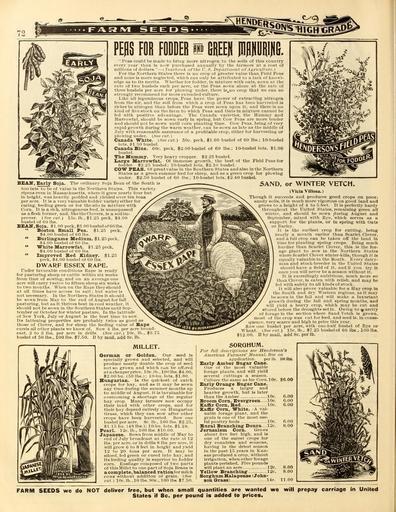 | Keywords: Everything for the garden (Page 72) (16024835744).jpg s see Hemlerson's <br> American I-'urmers' Munuiil free on <br> application per lb 100 lbs <br> Early Amber Sn ar Cane <br> One of the most valuable <br> forage plants and will yield <br> several cuttings a season <br> Culture the same as for Corn 10c 6 00 <br> Early Orang-e Sugar Cane <br> Produces a larger and <br> heavier growth but is later <br> than the Amber 10c <br> Broom Com Evergreen 10c <br> Kaffir Com Bed 10c <br> Kaffir Com White 'A val- <br> ualile forage plant and the <br> grain is one of the most use- <br> ful poultry feeds 10c <br> Bural Branching DoTira l2c <br> Jerusalem Com Grows <br> about five feet high and is <br> one of the surest crops for <br> dry countries and seasoHs <br> having in the driest season <br> in the past 15 years in Kan- <br> sas produced a crop without <br> irrigation when other forage <br> plants perished Five pounds <br> will plant an acre 12c <br> Yellow Branching' 12c <br> Sorghum Halapense John- <br> son Grass 14c <br> 8 00 <br> 8 00 <br> 11 00 <br> FARM SEEDS we do NOT deliver free but when small quantities are wanted we wiH prepay carriage in United <br> States if 8c per pound is added to prices 42383113 133997 66553 Page 72 Text http //www biodiversitylibrary org/page/42383113 1902 10 5962/bhl title 66553 Henry G Gilbert Nursery and Seed Trade Catalog Collection ; Peter Henderson Co NameFound H ifety NameFound Medium NameConfirmed Medium NameBankID 4904049 NameFound Villosa NameConfirmed Villosa EOLID 57639 NameBankID 2692730 Biodiversity Heritage Library Garden Stories Catalogs Flowers Peter Henderson Co Plants Ornamental Seed industry and trade Seeds Trade catalogs Vegetables U S Department of Agriculture National Agricultural Library bhl page 42383113 dc identifier http //biodiversitylibrary org/page/42383113 BHLinbloom peter henderson co plants ornamental u s department of agriculture national agricultural library bhlinbloom Information field Flickr posted date ISOdate 2015-02-25 PD-old-70-1923 Everything for the garden 1902 Photos uploaded from Flickr by Fæ using a script Files from the Biodiversity Heritage Library released as Attribution-NonCommercial-ShareAlike |
