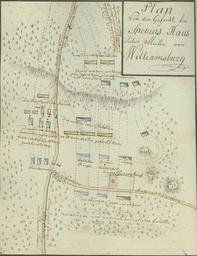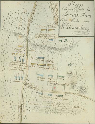 | Keywords: Ewald SpencersOrdinary 1781.jpg A German map depicting the action at the Battle of Spencer's Ordinary The caption reads Plan von dem Gefecht bei Spensers Haus Sieben Meilen von Williamsburg or Plan of the battle at Spencer's House Seven Miles from Williamsburg American positions are in blue British positions in yellow Keystone Library Network Digital Collection http //digital klnpa org/u /blmmap 15 1781 Johann Ewald 1744-1813 Old maps of the American Revolution Battles of the American Revolutionary War Old maps of Virginia PD-old-100 |