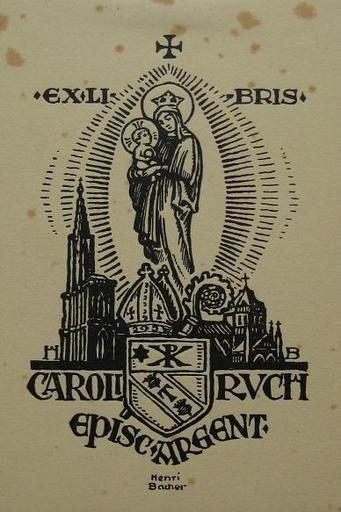 | Keywords: Ex-libris Ruch par Bacher.jpg  Monseigneur Ruch par Henri Bacher Own Marc Baronnet Henri Bacher 1887-1936 date after 1919 PD-old-70 Henri Bacher Ex-libris of France 20th-century ex-libris Remote views of Notre-Dame de Strasbourg Coats of arms of bishops of the Roman Catholic Diocese of Nancy Regina Coeli Heraldic Ex Libris |