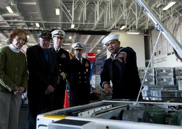 | Keywords: Ex-president Carter visits USS Carl Vinson 130222-N-TZ605-982.jpg en Aviation Support Equipment Technician 2nd Class Jeffrey Rollon shows former President Jimmy Carter former first lady Rosalynn Carter and former Secretary of the Navy John Dalton various aircraft transport vehicles as part of a static display during a tour in the hangar bay aboard the aircraft carrier USS Carl Vinson The Carters and Dalton visited Carl Vinson with more than 200 members of The Carter Center 2013-02-22 CVN 70 https //www dvidshub net/image/875062 130222-N-TZ605-982 2013-02-27 05 06 CORONADO CA US PD-USGov-Military-Navy USS Carl Vinson CVN-70 Images from DoD uploaded by Fæ Rosalynn and Jimmy Carter |