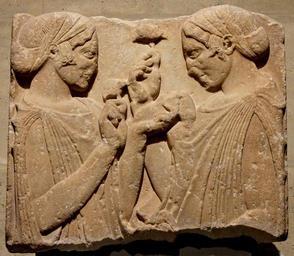 | Keywords: Exaltation fleur Louvre Ma701.jpg So-called Exaltation de la Fleur exaltation of the flower fragment from a grave stele two women wearing a peplos and kekryphalos hair net hold poppy or pomegrenate flowers and maybe a small bag of seeds Parian marble made in Pharsalos ca 470 “460 BC From Pharsalos Thessaly Fragment de stèle funéraire relief dit de « l'Exaltation de la fleur » deux femmes portant le péplos et le cécryphale filet à cheveux tiennent des fleurs de pavot ou de grenade et peut-être un sac de graines Marbre de Paros v 470 “460 av J -C fabrication et provenance Pharsale Thessalie ca 470 460 BC Parian marble cm 56 5 67 14 Institution Louvre Department of Greek Etruscan and Roman Antiquities Denon lower ground floor room 3 5499 object history credit line ProvenanceEvent excavation Léon Heuzey and Henri Daumet 1863 Pharsalos in region Thessaly accession number Ma 701 own photo date 2006 Marie-Lan Nguyen artwork license PD-old-100 photo license other versions Ancient Greek reliefs in Paris Severe style Greek sculptures Parian marble sculptures Greek antiquities in the Louvre - Room 3 Sculptures of flowers in France Peplos 470s BC reliefs Ancient Greek funerary steles in France Hairnets |