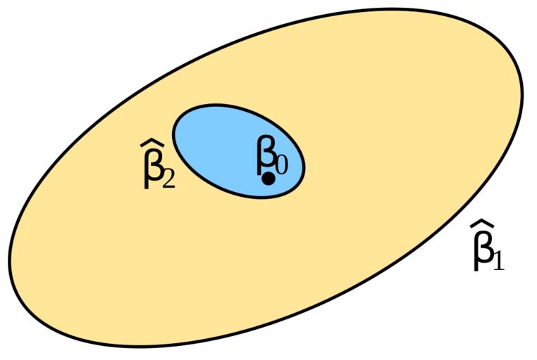 | Keywords: Example when estimator bias is good.svg en This simple diagram shows two estimators β1 and β2 of true parameter β0 Although second estimator is biased it is clearly superior to the former own Stpasha 2009-07-06 Source code Mathematica <nowiki> Show Graphics EdgeFormThickness0 006 RGBColor1 0 9 0 6 RotateDisk 0 0 1 2 2 Black FontSize->14 Inset \ \ \ SubscriptBox\ \Beta\ \ 1\ \ 1 6 -0 5 Thickness0 006 Line 1 48 - 35 1 56 - 30 1 65 - 35 Graphics EdgeFormThickness0 006 RGBColor0 5 0 8 1 RotateDisk -0 2 0 2 0 5 0 3 -0 4 Black FontSize->14 Inset \ \ \ SubscriptBox\ \Beta\ \ 2\ \ -0 8 0 1 Thickness0 006 Line - 92 0 24 - 84 0 29 - 75 0 24 Graphics Disk 0 0 0 05 FontSize->14 Inset \ \ \ SubscriptBox\ \Beta\ \ 0\ \ 0 02 0 2 ImageSize -> Small Export c /biases svg ;</nowiki> Statistical inference |