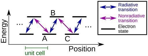 | Keywords: ExampleOfBulkPhotovoltaicEffect.svg en An example of a simple system that would exhibit the bulk photovoltaic effect There are two electronic levels per unit cell separated by a large energy gap say 3eV The blue arrows indicate radiative transitions i e an electron can absorb a UV photon to go from A to B or it can emit a UV photon to go from B to A The purple arrows indicate nonradiative transitions i e an electron can go from B to C by emitting many phonons or can go from C to B by absorbing many phonons When light is shining an electron will occasionally move right by absorbing a photon and going from A to B to C However it will almost never move in the reverse direction C to B to A because the transition from C to B requires an improbably large thermal fluctuation Therefore there is a net rightward photocurrent 2014-01-03 13 33 29 own Sbyrnes321 cc-zero Uploaded with UploadWizard Photovoltaics Semiconductor physics Semiconductor band diagrams |
