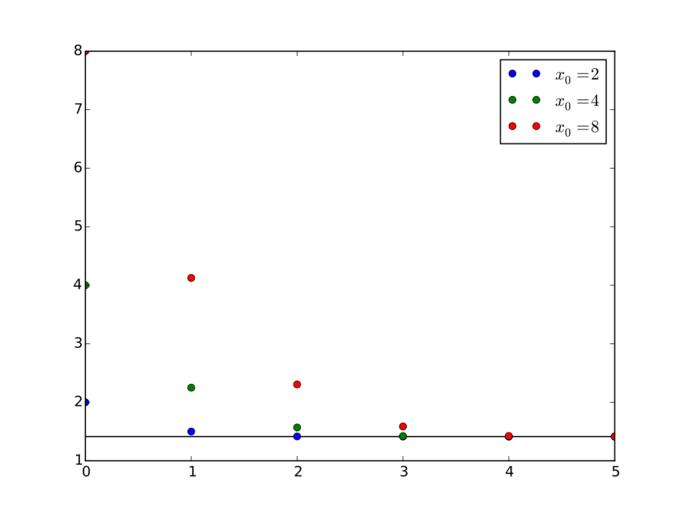 | Keywords: Examples for calculating the square root of 2 with Heron's method.svg en First elements of the sequence we get when we calculate <math>\sqrt 2</math> with Heron's Method via the recursion <math>x_ n+1 \tfrac 12\left x_n + \tfrac 2 x_n \right </math> with the starting points <math>x_0 2</math> <math>x_0 4</math> and <math>x_0 8</math> 2016-05-13 own http //kulla me Stephan Kulla User Stephan Kulla other fields Matplotlib + import numpy as np import matplotlib pyplot as plt n_max 5 0 def square_root_seg a x_0 x_n x_0 while True yield x_n x_n x_n + a / x_n / 2 0 ns np arange 0 n_max + 0 01 1 plt plot 0 n_max np sqrt 2 np sqrt 2 color black for x_0 in 2 0 4 0 8 0 xs np fromiter square_root_seg 2 0 x_0 np float ns size plt plot ns xs o label x_0 d int x_0 plt text 7 2 np sqrt 2 -0 1 \sqrt 2 plt legend loc 'upper right' plt savefig Examples for calculating the square root of 2 with Heron's method svg cc-zero Numerical analysis |