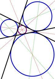 | Keywords: Excircles.svg A triangle with its incircle excircles and angle bisectors Excircles png 2013-07-17 Excircles png AxelBoldt SVG version this file Patrick87 Information field http //www emis de/misc/software/gclc/ GCLC source hidden left click to expand <source lang text> The three vertices of the triangle point A 25 70 point B 20 55 point C 45 60 They define three lines line a B C line b A C line c A B The three internal angle bisectors bis bis_A B A C bis bis_B A B C bis bis_C B C A The three external angle bisectors They are perpendicular to the internal ones perp extbis_A A bis_A perp extbis_B B bis_B perp extbis_C C bis_C The centers of the in- and excircles intersec incenter bis_A bis_B intersec a_excenter bis_A extbis_B intersec b_excenter bis_B extbis_C intersec c_excenter bis_C extbis_A The incircle Find a point on the incircle by going perpendicular from the incenter to b for instance perp dummy_line incenter b intersec touch dummy_line b circle incircle incenter touch The excircles perp dummy_line a_excenter a intersec touch dummy_line a circle a_excircle a_excenter touch perp dummy_line b_excenter b intersec touch dummy_line b circle b_excircle b_excenter touch perp dummy_line c_excenter c intersec touch dummy_line c circle c_excircle c_excenter touch Now draw everything dim 70 100 color 0 200 0 drawline extbis_A drawline extbis_B drawline extbis_C color 255 0 0 drawline bis_A drawline bis_B drawline bis_C linethickness 3 color 120 0 120 drawcircle incircle color 0 0 240 drawcircle a_excircle drawcircle b_excircle drawcircle c_excircle color 0 0 0 drawline a drawline b drawline c </source> Incircle and excircles Images with GCLC source code Incenter |