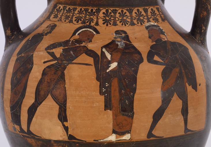 | Keywords: Exekias - Black-figure Belly Amphora with the Reclamation of Helen and Herakles and Kerberos - Walters 4816 - Side B Detail.jpg In another of his labors Herakles has returned from the underworld with Kerberos the multi-headed dog who guards its entrance while the messenger-god Hermes leads the way with two women looking on On the back a warrior draws his sword on a modestly veiled woman in the presence of two onlookers; this scene has been identified as Menelaos' recovery of Helen after the capture of Troy between 540 530 BC Archaic terracotta H 19 x W 12 5/8 x Diameter at rim 7 15/16 in 48 2 x 32 07 x 20 2 cm accession number 48 16 30822 Don Marcello Massarenti Collection Rome before 1897 no 189 Henry Walters city Baltimore Walters Art Museum Henry Walters Acquired by Henry Walters with the Massarenti Collection 1902 Heroes Mortals and Myths in Ancient Greece The Walters Art Museum Baltimore; Frist Center for the Visual Arts Nashville; San Diego Museum Of Art San Diego; Alexander S Onassis Public Benefit Foundation USA New York 2009-2011 place of origin Athens Greece Walters Art Museum license Ancient Greek black-figure pottery in the Walters Art Museum Exekias Media contributed by the Walters Art Museum needs category review Media contributed by the Walters Art Museum needs artist update |