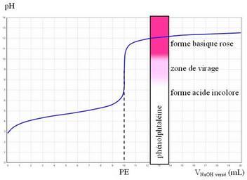 | Keywords: Exemple dosage acide faible base forte.jpg exemple de dosage d'un acide faible acide acétique 0 1 M par une base forte soude 0 1 M courbe de l'évolution du pH en fonction du volume de base versé équivalence repérée par la phénolphtaléine own 04/06/2007 Sébastien Bruneau cédé au domaine public Phenolphthalein |