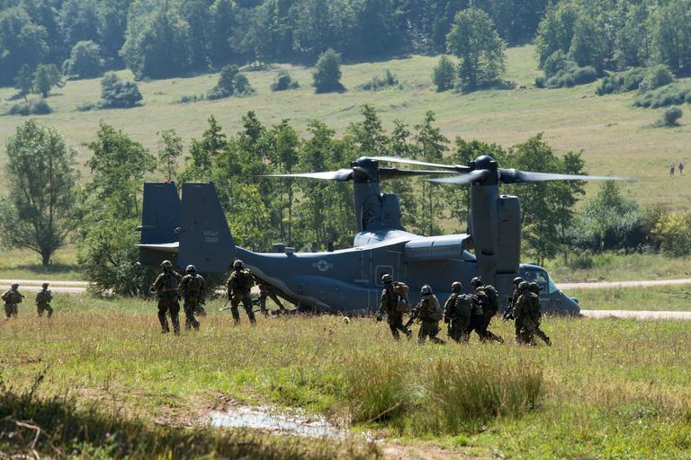 Keywords: swift response swiftresponse parachutist air assault airassault hohenfels germany nato mons italy 2 para 2para wallanie belgium outdoor landscape field grassland A V-22 Osprey aircraft extracts US Rangers following a simulated air assault on Exercise Swift response in Hohenfels, Germany Over 5,000 personnel from 11 NATO countries are participating in Exercise Swift Response, the largest combined airborne training exercise in Europe since the end of the Cold War. The exercise is being held from 18th August to 12th Septemeber in Germany, Romania, Bulgaria and Italy and one of the major events featured over 1,000 multinational troops parachuting into a Drop Zone on a single day in Hohenfels, Bavaria. A V-22 Osprey aircraft extracts US Rangers following a simulated air assault on Exercise Swift response in Hohenfels, Germany Over 5,000 personnel from 11 NATO countries are participating in Exercise Swift Response, the largest combined airborne training exercise in Europe since the end of the Cold War. The exercise is being held from 18th August to 12th Septemeber in Germany, Romania, Bulgaria and Italy and one of the major events featured over 1,000 multinational troops parachuting into a Drop Zone on a single day in Hohenfels, Bavaria.