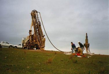 Keywords: Exploration drill.jpg Mobile truck-mounted drill-rig The crushed rock-samples chips are examined and bagged at the Cyclone to the right Photo taken by User Geoz Uruguay 1999 2005-11-06 own assumed Geoz Drilling rigs