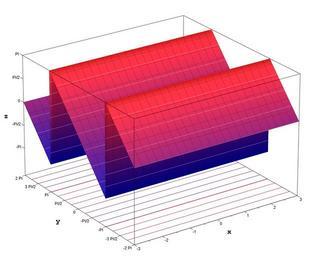 | Keywords: Exponential Function Argument.png Diagram of the argument of the exponential function in the complex plane The plot is given by <math>z \operatorname arg \left \exp \left x + i y \right \right </math> Own drawing Plotted in MuPAD code given below 2007-04-25 Inductiveload See Exponential function for related graphics MuPAD Code <pre> q arg exp x+I y conts 10 projectionlevel -5 ylimit 2 PI xlimit 3 submeshlevel 0 colourfunc zip RGB VenetianRed RGB DarkBlue a b -> q x y +PI / 6 a - q x y -PI / 6 b funcplot plot Function3d q x y x -xlimit xlimit y -ylimit ylimit Mesh 23 23 Submesh submeshlevel submeshlevel LineColor RGB Black 0 4 LineWidth 0 15 AdaptiveMesh 10 FillColorFunction colourfunc AxesTitleFont Courier New Bold 14 ViewingBoxZRange -5 PI YTicksNumber None YTicksAt -3 PI/2 -3 PI/2 -PI -PI -PI/2 -PI/2 -2 PI -2 PI 0 0 PI/2 PI/2 PI PI 3 PI/2 3 PI/2 2 PI 2 PI ZTicksNumber None ZTicksAt -PI -PI -PI/2 -PI/2 0 0 PI/2 PI/2 PI PI contours plot modify funcplot ZContours -3 14 3 14 step 0 7853 LineWidth 0 2 LineColor RGB Gray90 0 5 XLinesVisible FALSE YLinesVisible FALSE Filled FALSE projcontours plot Transform3d 0 0 projectionlevel 1 0 0 0 1 0 0 0 0 plot modify funcplot ZContours -3 14 3 14 step 0 7853 LineWidth 0 2 LineColorType Dichromatic LineColor RGB VenetianRed 0 99 LineColor2 RGB DarkBlue 0 99 XLinesVisible FALSE YLinesVisible FALSE Filled FALSE camera plot Camera -40 -120 60 -0 5 -1 -0 5 0 1 ploteverything plot Canvas funcplot contours projcontours Width 8 5 unit inch Height 7 unit inch camera plot ploteverything </pre> Surface plots of complex exponential function Images with MuPad source code |