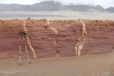 | Keywords: valley of ten thousand smokes valleyoftenthousandsmokes outdoor landscape Most fumaroles are complexly zoned in mineralogy and color. The throat of the fumaroles (seen as the vertical whitish lines in the photo) was a place of high acidity and temperatures. High temperatures and acid leached minerals away from these throats. Hiking poles are about 120 cm tall. NPS photo by M. Fitz. Most fumaroles are complexly zoned in mineralogy and color. The throat of the fumaroles (seen as the vertical whitish lines in the photo) was a place of high acidity and temperatures. High temperatures and acid leached minerals away from these throats. Hiking poles are about 120 cm tall. NPS photo by M. Fitz. |